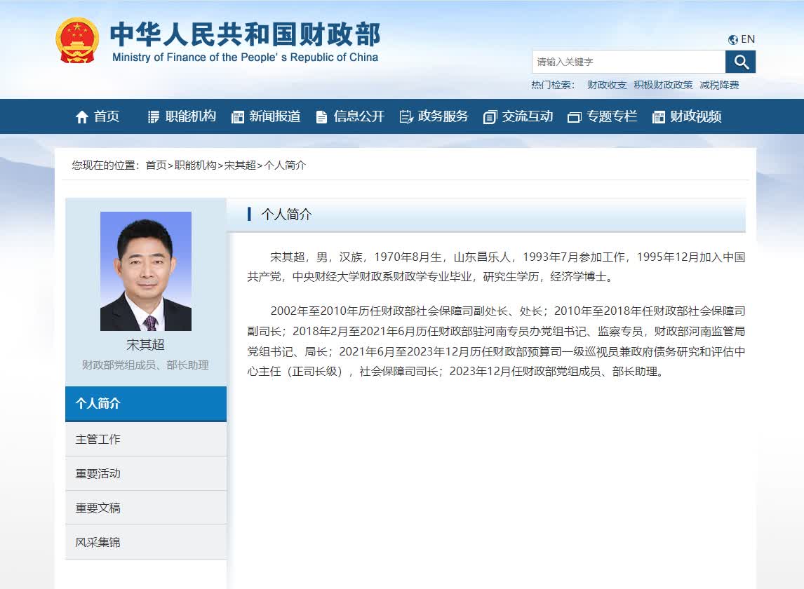 財政部網站顯示,宋其超,男,漢族,1970年8月生,山東昌樂人,1993年7月參加工作,中央財經大學財政系財政學專業畢業,研究生學歷,經濟學博士。