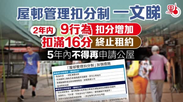 今年,房屋署引入新思維加強打擊濫用公屋的措施。房委會早前通過一項「屋邨管理扣分制」(扣分制),公屋租戶9種行為扣分增加,滿16分終止租約,並且5年內不得再申請公屋。