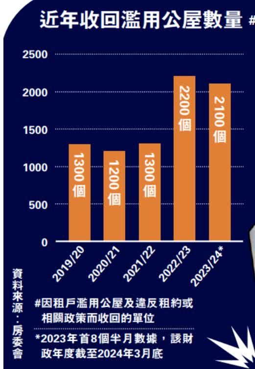 這些措施初見成效。本財政年度首八個半月已收回2100個濫用及違約公屋單位,接近上一個年度全年總量。