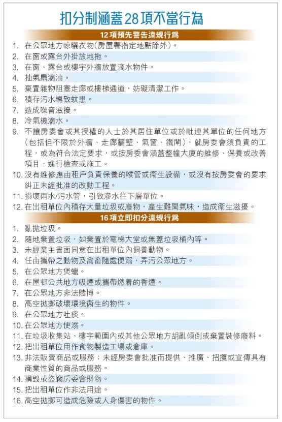 扣分項目很嚴格,在公眾地方晾曬衣服、冷氣機滴水、抽氣扇滴油都在其列。