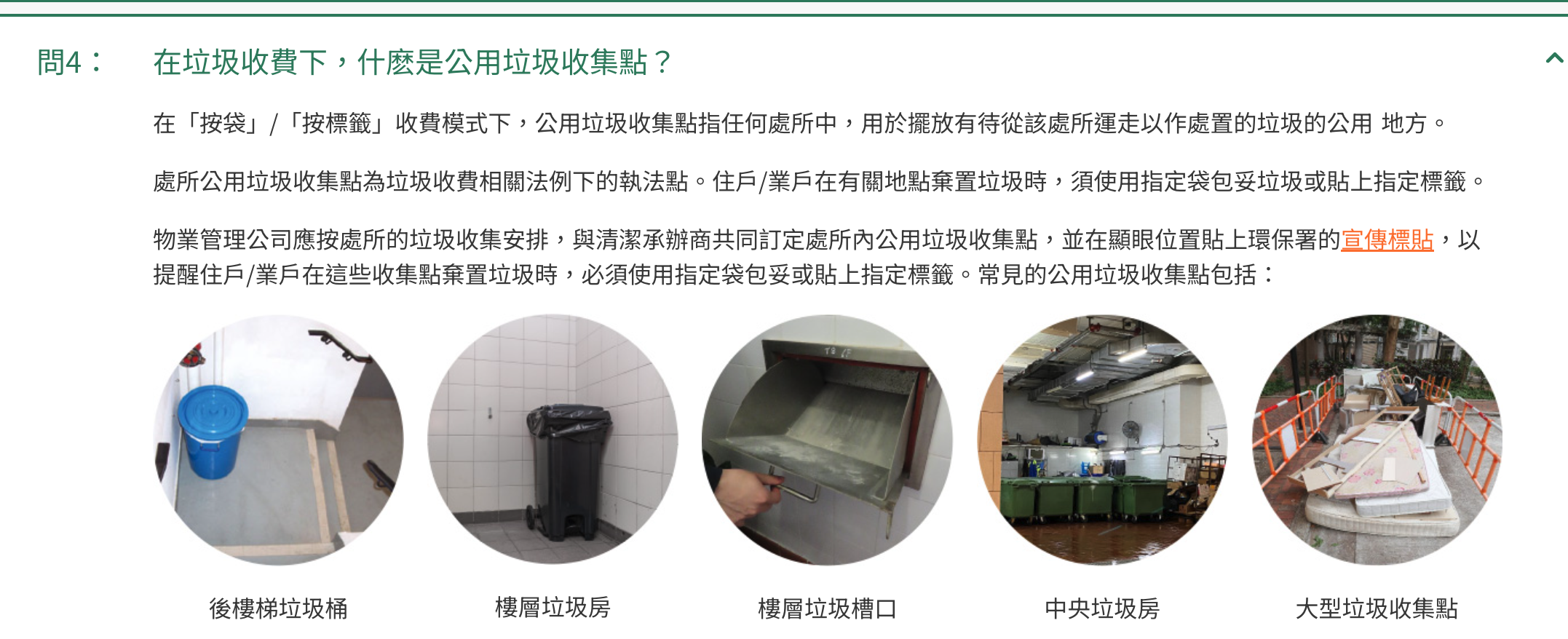 A:處所內公用垃圾收集點、食環署垃圾收集站、食環署垃圾桶站、食環署或其承辦商垃圾車、私營廢物收集商壓縮型垃圾車。