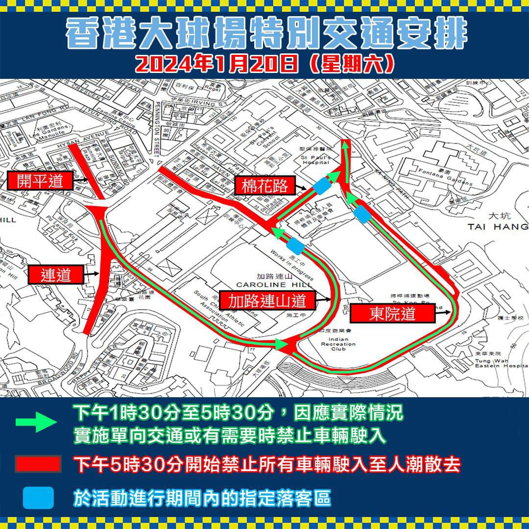 大公文匯全媒體報道,世界足球傳奇盃2024將於本周六(20日)在香港大球場舉行。為便利市民觀賞及確保公共安全,警方將在港島區香港大球場一帶實施人流管制措施及特別交通安排。