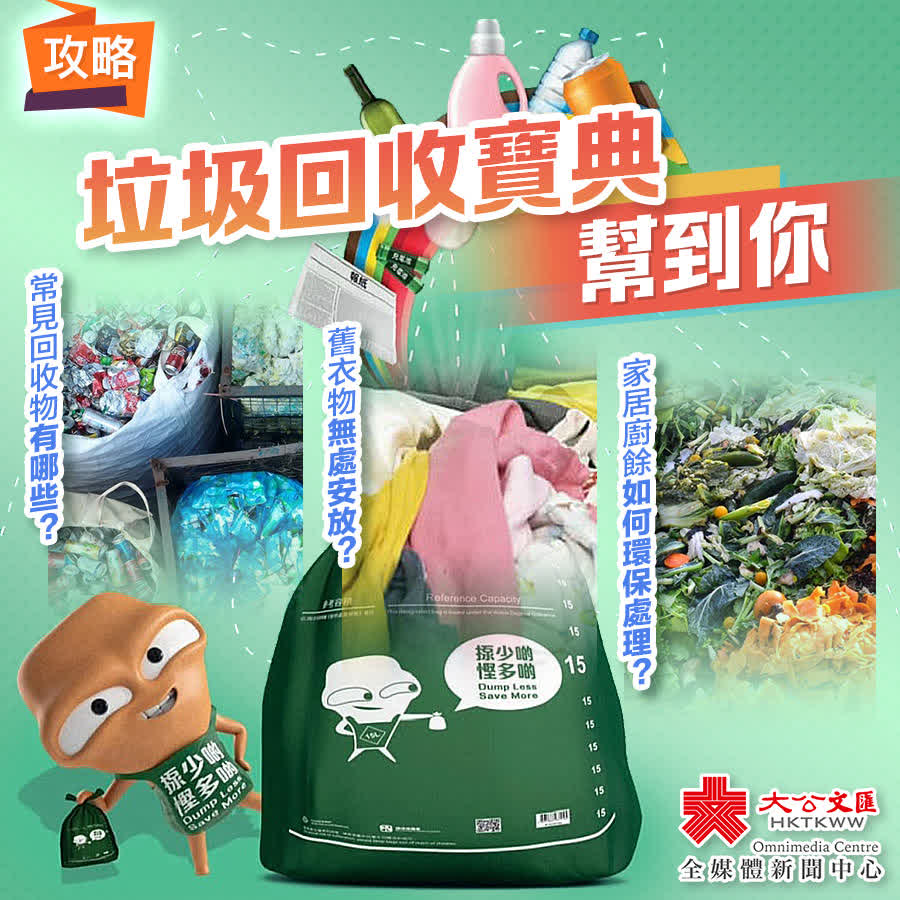 大公文匯全媒體報道,垃圾收費將在4月1日生效,餘下時間不足3個月,公眾除關注實施細則,亦關心舊物廚餘等物料的處理方式。大公文匯全媒體整理「垃圾回收寶典」,除介紹市民熟悉的「綠在區區」,亦推介舊衣物及廚餘回收點,更有手機應用程式(APP)幫助大家分類回收及走塑。