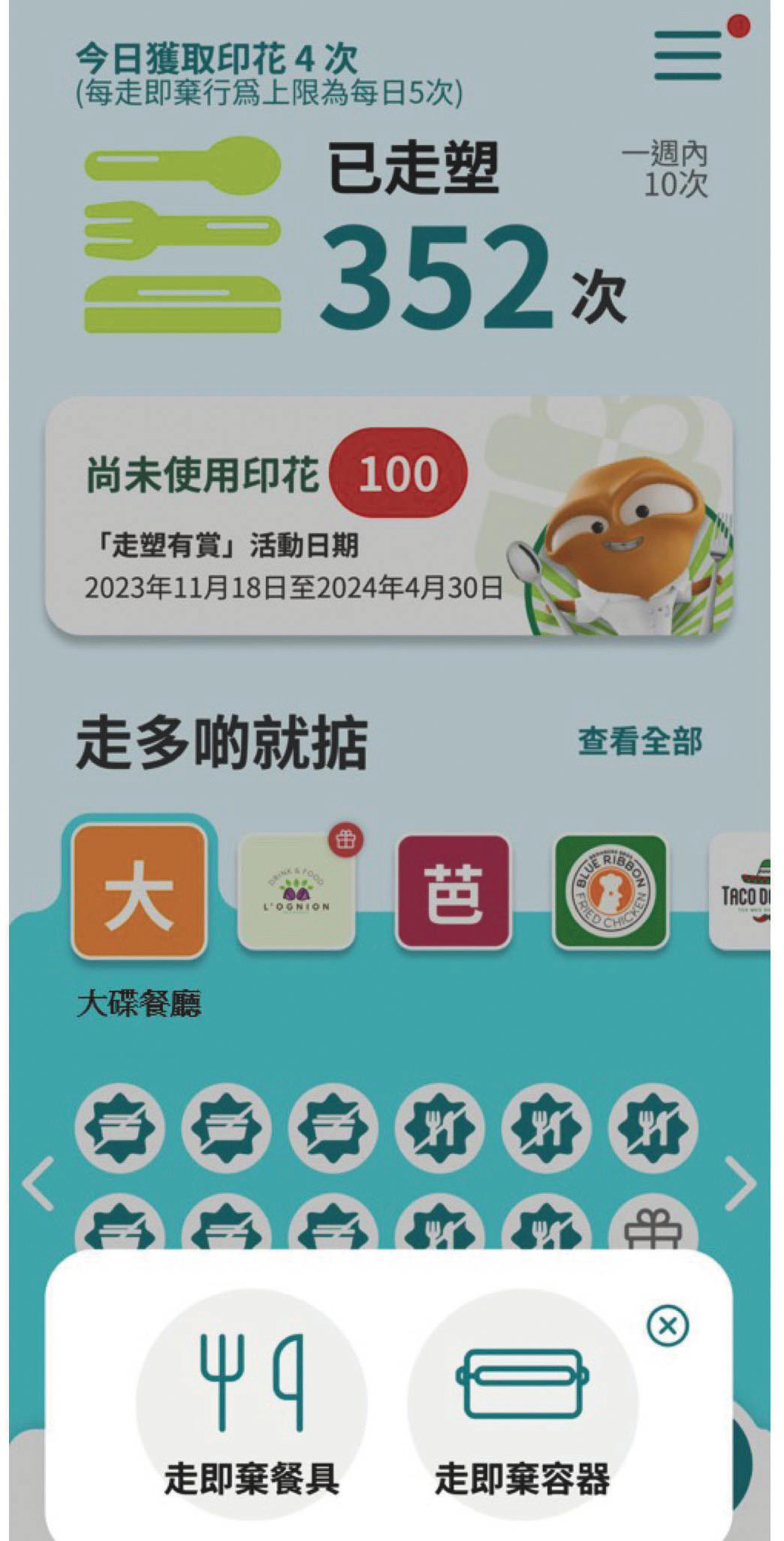 運動由即日起至今年4月30日展開,市民在超過750間參與運動的餐飲食肆購買外賣時免取即棄餐具或容器,可透過全新的「走塑有賞」手機APP儲印花及換獎賞。凡免取一套即棄餐具,即可獲一個印花;如該餐飲食肆同時參與了環保署的「咪嘥盒食店」計劃,在該店免取一個即棄容器(即餐盒或杯),可獲兩個印花。市民集齊指定數量的印花,可換領個別餐飲食肆提供的獎賞(例如飲品、小食及折扣券),或透過「走塑有賞」手機APP把電子印花轉換成為「綠綠賞」積分或「綠綠賞」電子禮券,在全線44間「綠在區區」回收環保站或回收便利點換領精美的可重用餐具套裝或其他日常用品。