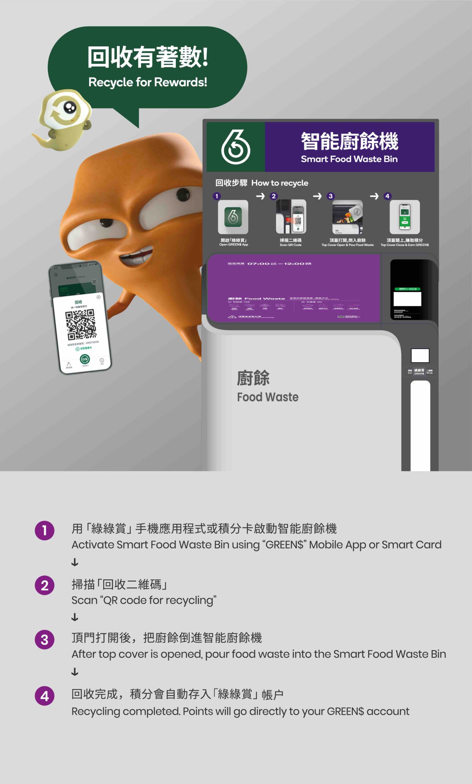智能回收桶使用方便,只須掃描「綠綠賞」會員二維碼,頂蓋便會自動打開,市民隨即可將廚餘放進回收桶。市民更可藉回收廚餘累積「綠綠賞」積分,並在指定公共屋邨禮品兌換機或「綠在區區」任何回收點兌換日用品或食品,例如麵食、香米、芥花籽油等。