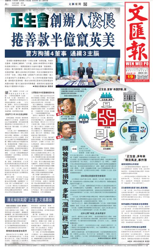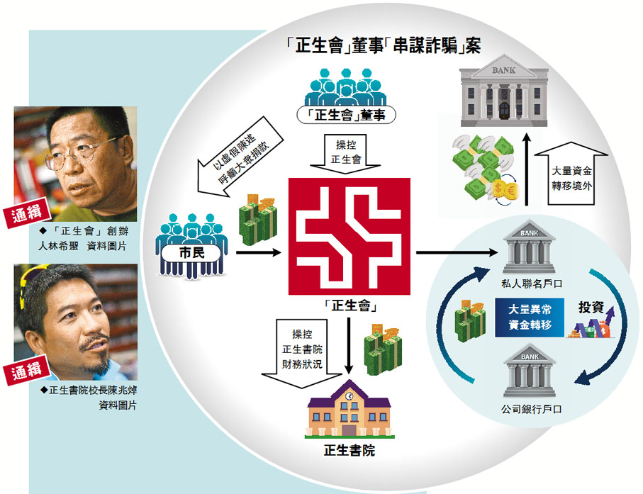 (香港文匯報記者 蕭景源)香港警方根據舉報和調查,日前以涉嫌「串謀詐騙」拘捕4名董事,及通緝已離港的「正生會」創辦人林希聖和正生書院校長陳兆焯等3人,揭開基督教正生會部分董事「借善謀財」的面紗。警方調查發現,陳兆焯於2020年底以正生書院財困為名發起眾籌,籌到4,500萬元市民捐款,但在完成籌款前半年已作好「走佬」(潛逃)準備。該捐款戶口經300次轉移,進入正生會其他戶口及董事私人戶口,有人用來炒賣資產中飽私囊,最終賣光香港物業,捲走5,000萬元香港市民捐款竄逃到英國和美國。警方已通知保安局禁毒處、教育局和社會福利署跟進正生書院學生的福祉。