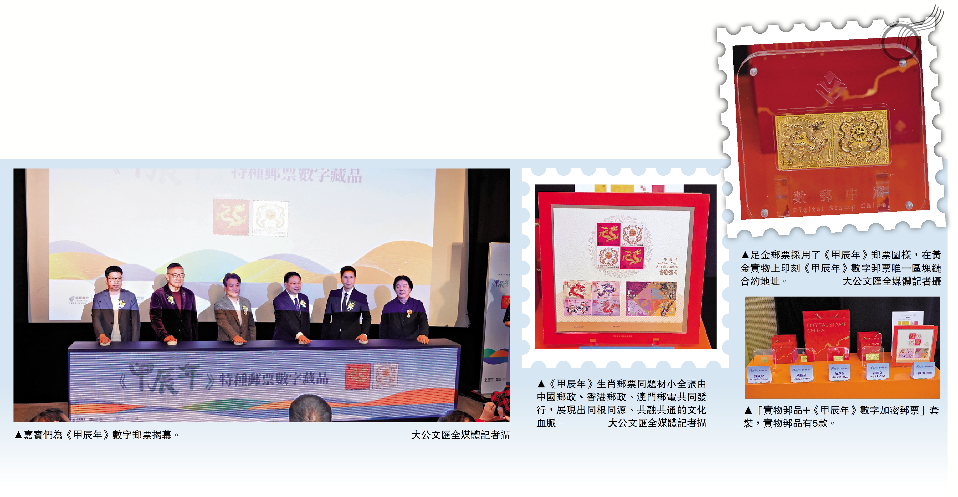 當中《甲辰年》生肖郵票小全張由中國郵政、香港郵政、澳門郵電共同發行,凝聚了三地對中國傳統生肖文化的多元化表達,展現出同根同源、共融共通的文化血脈;足金郵票金採用了《甲辰年》郵票圖樣,在黃金實物上印刻《甲辰年》數字郵票唯一區塊鏈合約地址。同時,為集郵愛好者提供個性化服務,在區塊鏈上銘刻個性化信息,如簽署收藏者的姓名,生日或贈送寄語等。詳情可瀏覽項目網站https://stamp.dgsfintech.com。