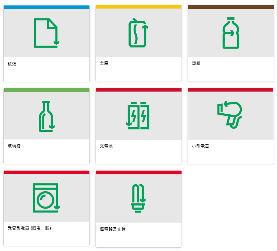 A:廢紙、金屬、塑膠、玻璃樽、充電池等垃圾可另行回收至「綠在區區」。