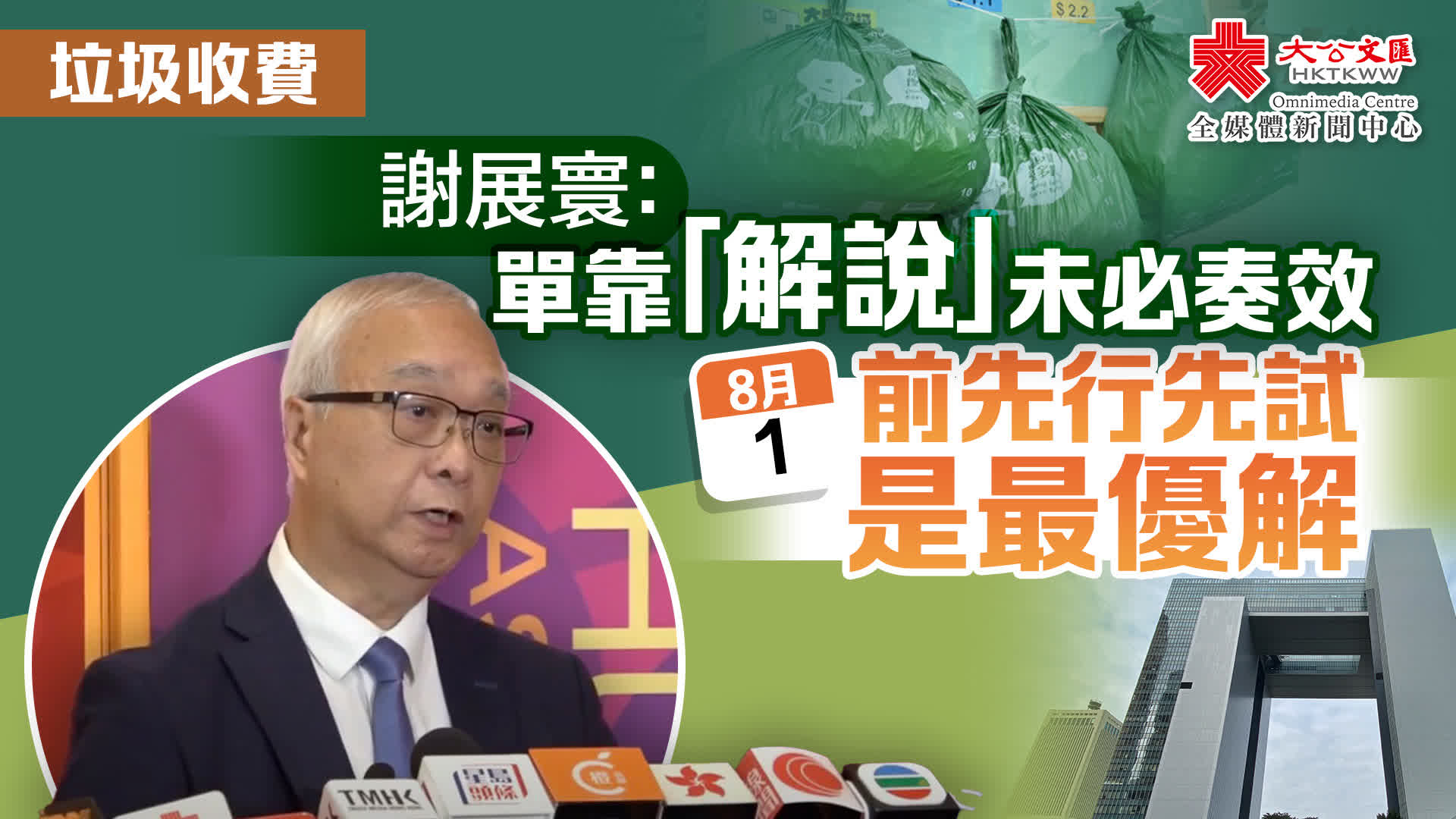 在記者會答問環節,謝展寰解釋,世界上其他城市在實行垃圾收費之前,都會進行長時間的宣傳,讓市民去適應新的生活習慣,因而在如今市民對垃圾收費細節缺乏了解的前提下,「負責任」的做法不是「硬着頭皮推行」,而是加強解說,在8月1日來臨之前,於一些樓宇先行先試並做檢視。此外,他承認以往的「解說」方式並非最好的做法。