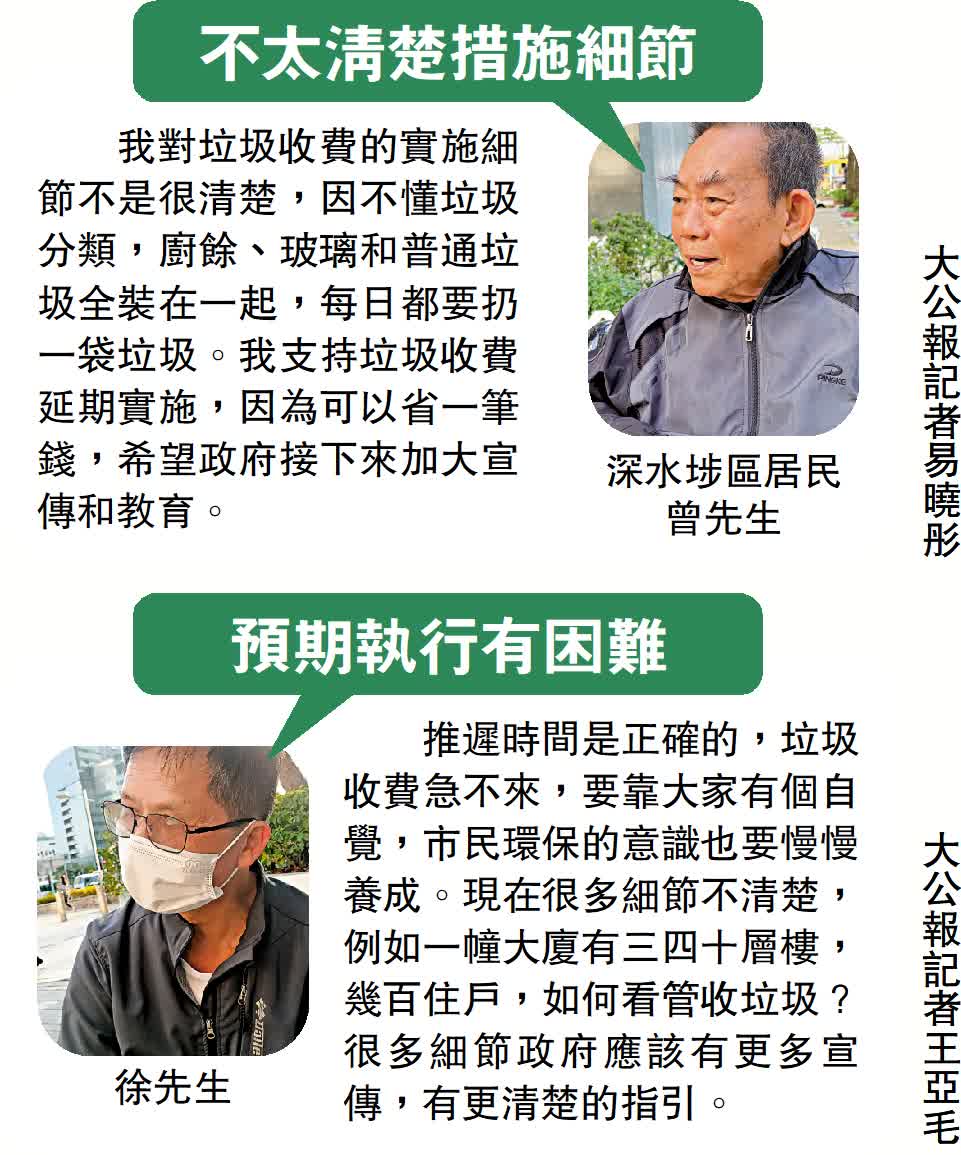(大公報記者 易曉彤、龔學鳴)原定於4月1日起實施的垃圾收費計劃,引起社會極大關注,市民、大廈法團、物業管理、清潔業界、運輸業界等紛紛反映執行上存在很多不清晰之處,擔心收費實施後變成垃圾圍城。環境及生態局昨日宣布把垃圾收費押後至8月1日起實施,但政府部門和部分私人樓宇如期於4月起先行先試,指定垃圾袋也將如期於下周五起出售。