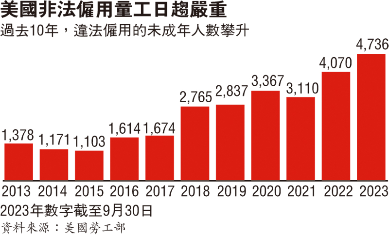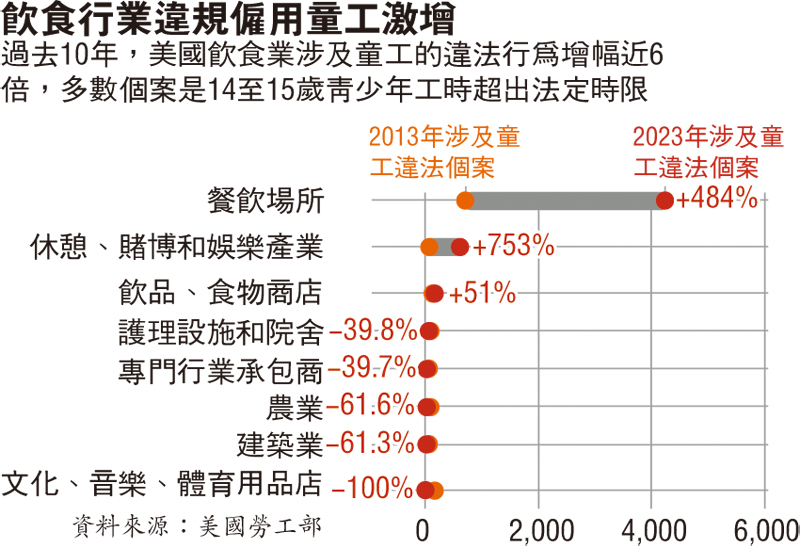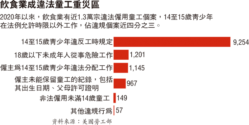 《華盛頓郵報》分析美國勞工部數據發現,過去10年間,美國錄得的違法僱傭行為增幅逾3倍,其中餐飲業增幅近6倍。去年截至9月,美國有4,700名未成年人被企業違法僱用,當中超過四分之三從事飲食業。從2020年到去年9月,全美飲食業近四分之三的違規行為,都是僱用14歲至15歲的未成年人超出法定時限長時間工作。