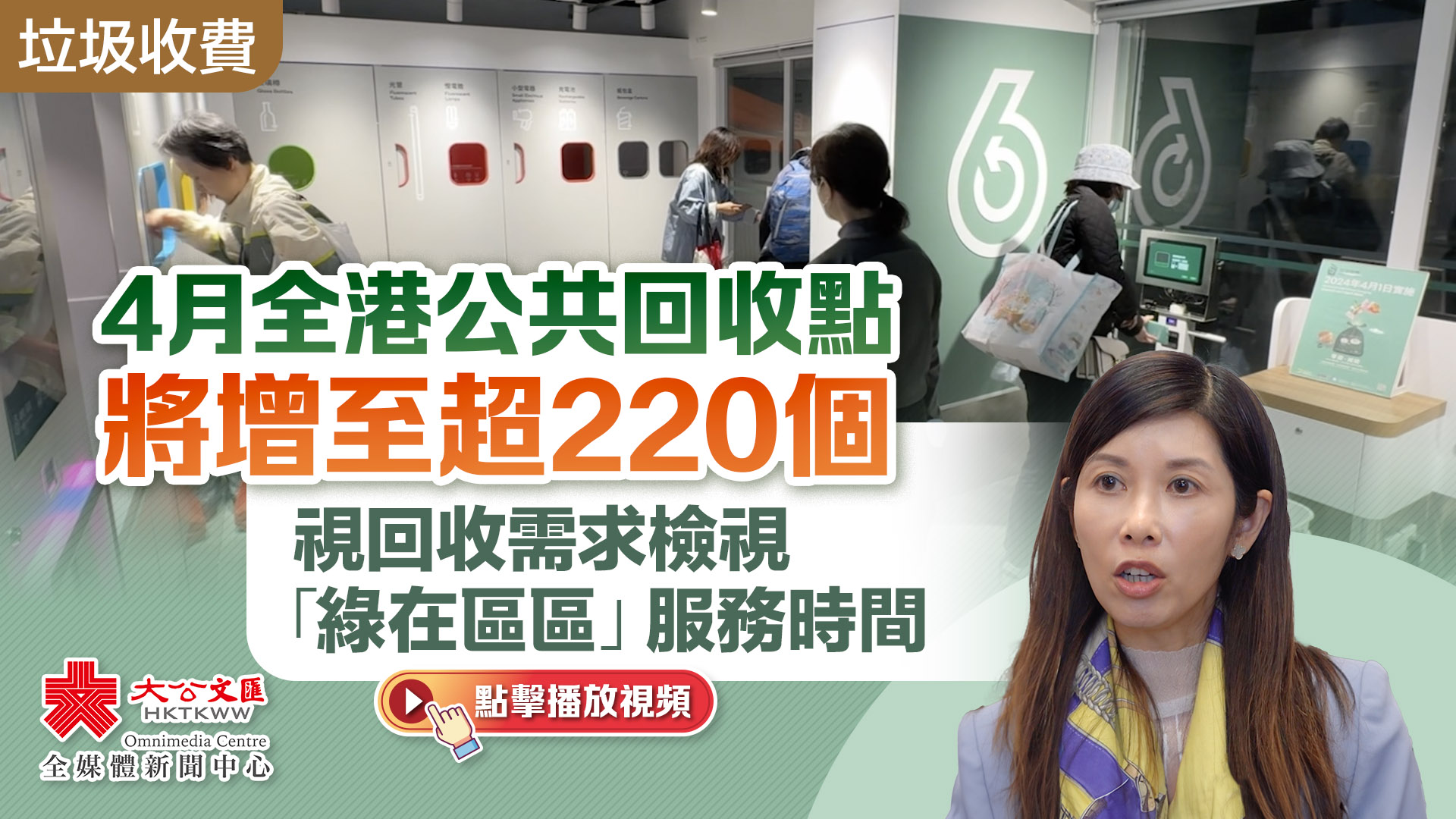 據介紹,「綠在區區」在全港18區設有11間環保教育及回收支援並重的回收環保站、34個貼近民居的回收便利點及逾130個以街站形式、每周定時定點運作的回收流動站,服務已覆蓋全港約80%單棟樓宇(包括「三無大廈」)。首個設於港鐵站的回收便利點「綠在青衣」將於今年首季投入服務。環保署正逐步將社區回收網絡擴展至50個公共屋邨,首兩個設於公屋的回收便利點「綠在葵芳」及「綠在大窩口」於去年6月底投入服務,此外,「綠在啟業」亦剛於去年12月底開始試運營,餘下的將會在今年4月1日前後相繼投入服務,屆時全港公共回收點將增加至超過220個。