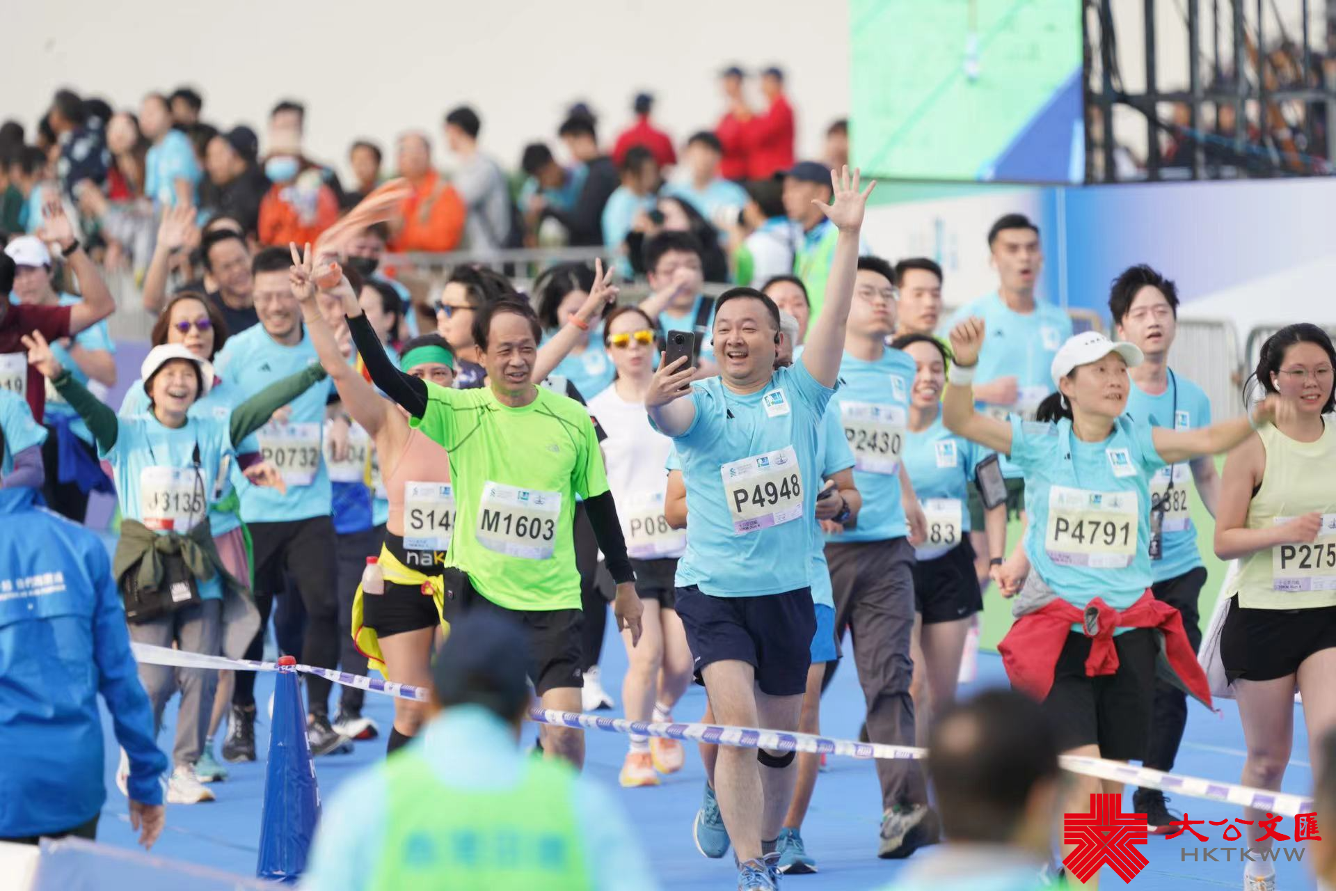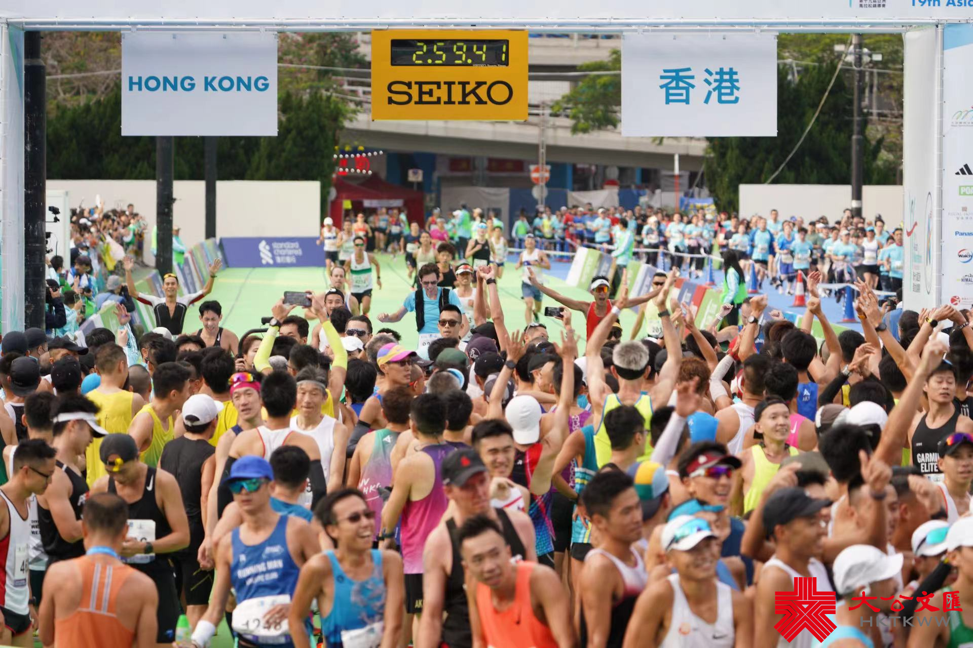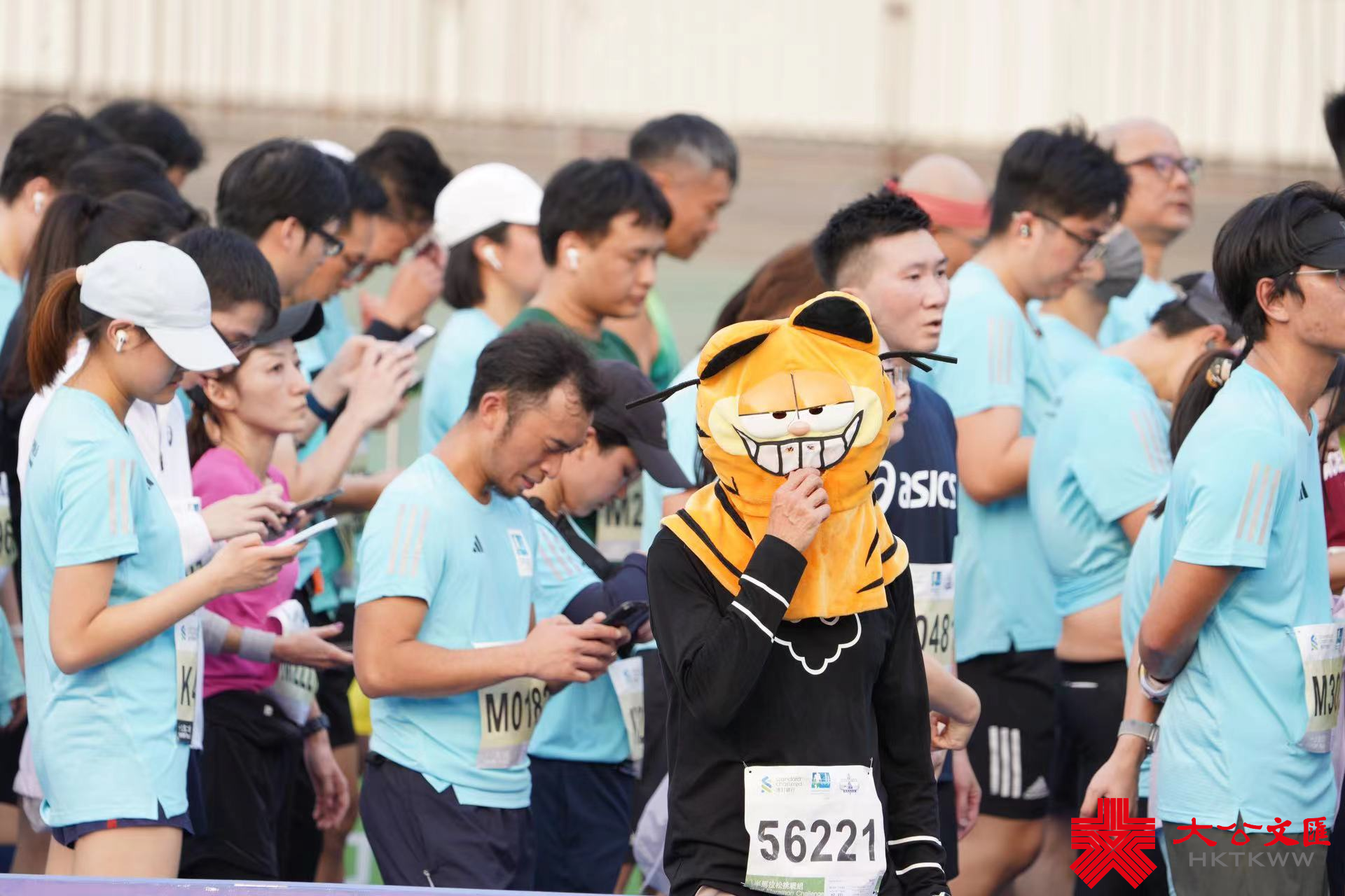 大公文匯全媒體報道,2024渣打馬拉松半馬挑戰組今早(21日)5時40分開跑,各組別跑手陸續到達維園終點。男子組全馬拉松賽事在3小時內能完成賽事的跑手,可以獲得一萬元,成為「萬金先生」,不少跑手都趕在最後時限大衝刺,爭取萬元獎金。「萬金先生」到達終點後又拍攝大合照,十分興奮。今日亦有不少人身穿特色服裝,「加菲貓」「江南四大才子」等現身跑場,十分吸睛。
