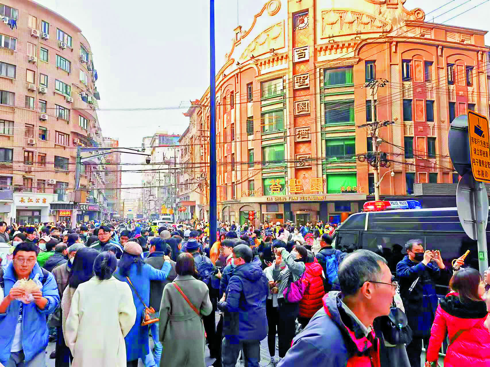 「本來我們一家人想趁着周末出來團聚一下,沒想到這兩周這裏包間一間也沒有,在樓下和員工問了好久,實在是沒有空位,沒辦法只能在黃河路逛逛,去別的飯店訂位了。」李阿姨在看完《繁花》後,也想和家人湊一回熱鬧,來到《繁花》中「至真園」原型苔聖園吃飯,沒想到生意火爆。據了解,苔聖園包間早已預訂至半個月以後,年夜飯更早早訂滿,即使如此,每日依然有新老顧客前來,希望在此回顧舊時上海的美味。