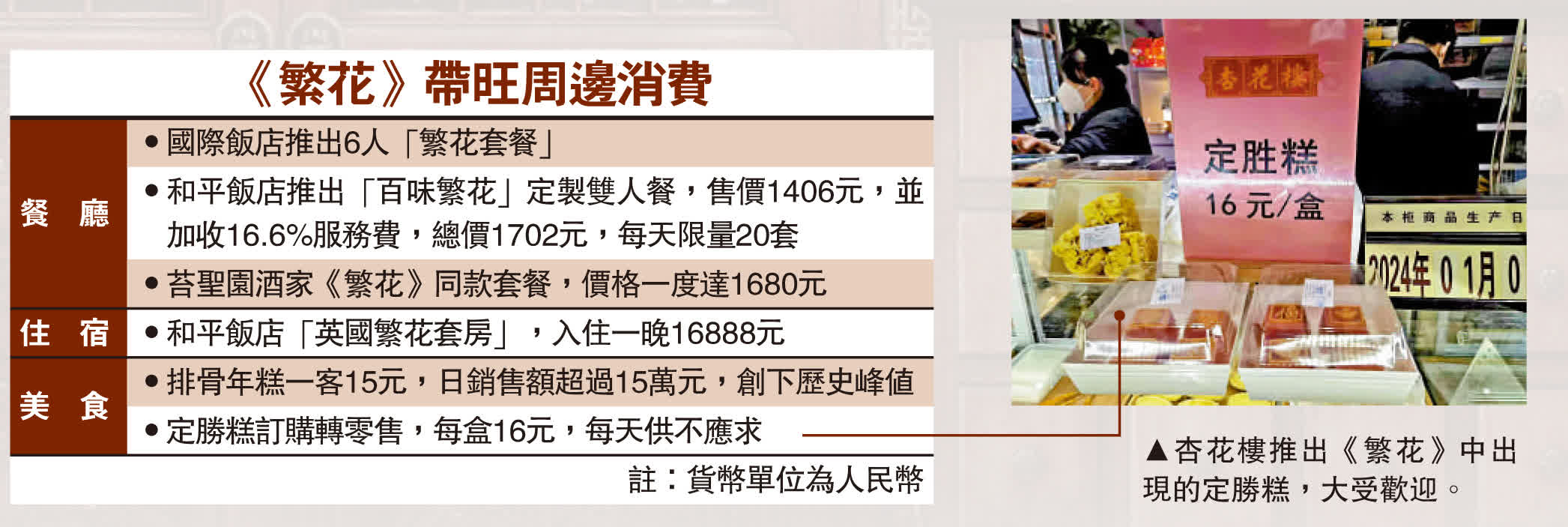 《繁花》熱潮下,黃河路被打卡人潮擠得水洩不通。苔聖園對面的杏花樓,迎來了倍增的客流。孔海明表示:「每天大廳都要翻枱,外賣業務也取得顯著增長。」至於在杏花樓排隊買定勝糕的朱阿姨說:「以前很少吃定勝糕這種糕點,但看到電視劇中出現了我們上海品牌,特別想回味小時候的味道,同時也給家人朋友代購一些,吃的是美食,也是情懷。」