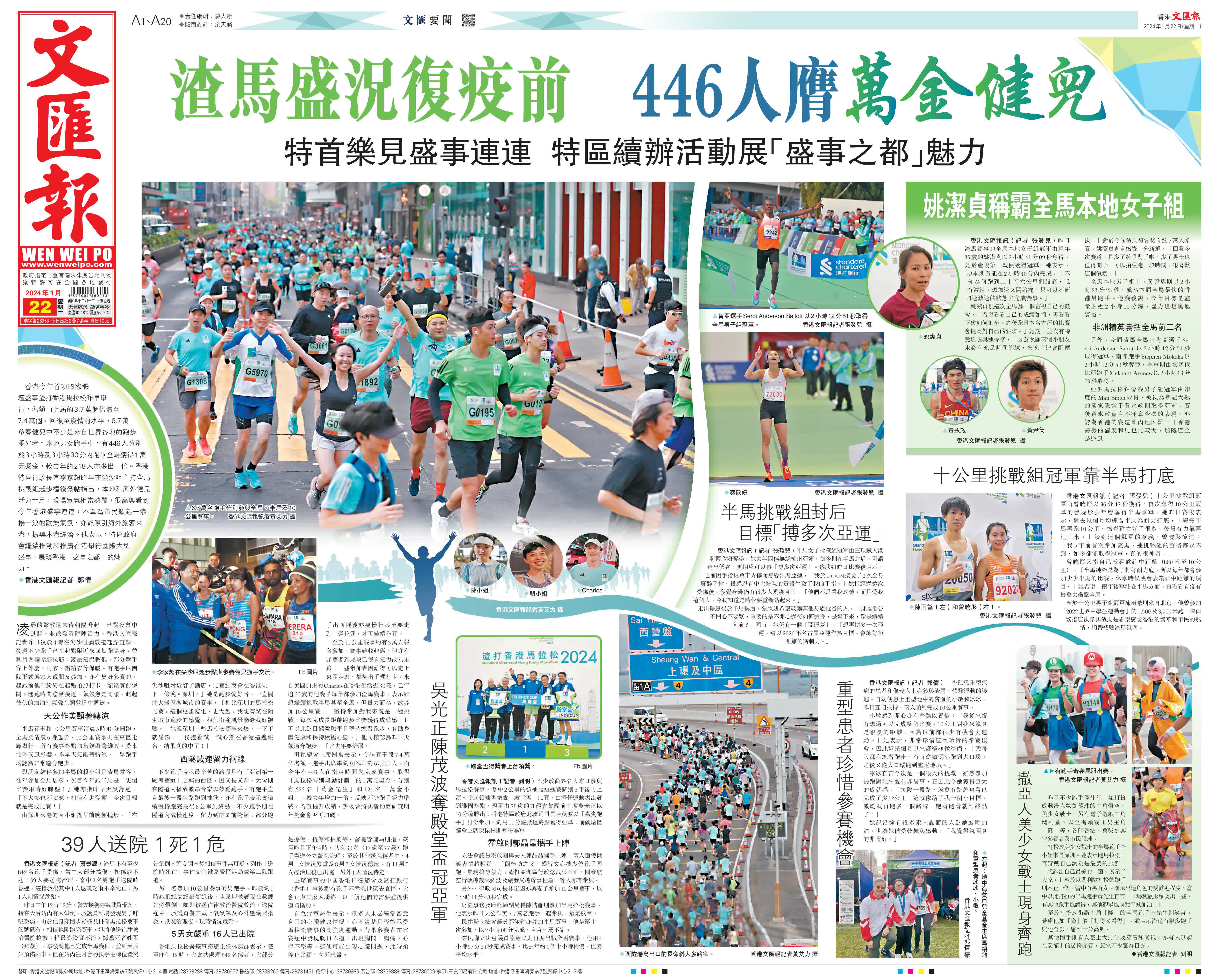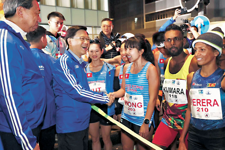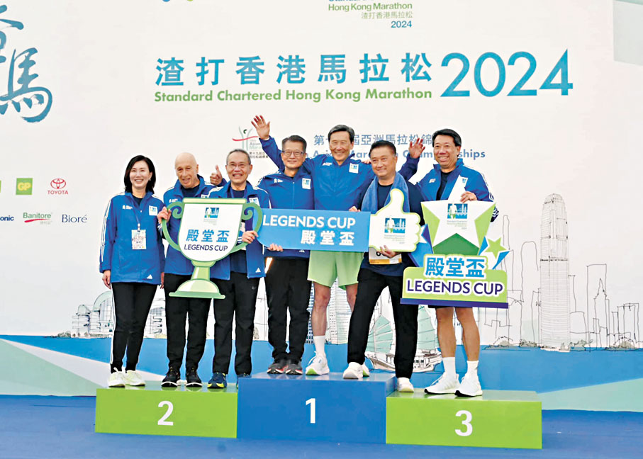 (香港文匯報記者 郭倩、劉明、張發兒、蕭景源)香港今年首項國際體壇盛事渣打香港馬拉松昨早舉行,名額由上屆的3.7萬個倍增至7.4萬個,回復至疫情前水平,6.7萬參賽健兒中不少是來自世界各地的跑步愛好者。本地男女跑手中,有446人分別於3小時及3小時30分內跑畢全馬獲得1萬元獎金,較去年的218人亦多出一倍。香港特區行政長官李家超昨早在尖沙咀主持全馬挑戰組起步禮後發帖指出,本地和海外健兒活力十足,現場氣氛相當熱鬧,很高興看到今年香港盛事連連,不單為市民掀起一浪接一浪的歡樂氣氛,亦能吸引海外旅客來港,振興本港經濟。他表示,特區政府會繼續推動和推廣在港舉行國際大型盛事,展現香港「盛事之都」的魅力。