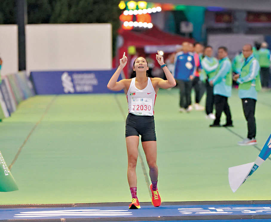 半馬女子挑戰組冠軍由三項鐵人港將蔡欣妍奪得,她去年因傷無緣杭州亞運,如今則在半馬封后,可謂走出低谷,更期望可以再「搏多次亞運」。蔡欣妍昨日比賽後表示,之前因手指被單車弄傷而無緣出席亞運,「我於15天內接受了3次全身麻醉手術,很感恩有中大醫院的黃醫生救了我的手指。」她指經過這次受傷後,發覺身邊仍有很多人愛護自己,「他們不是看我成績,而是愛我這個人,令我知道是時候要重新站起來。」