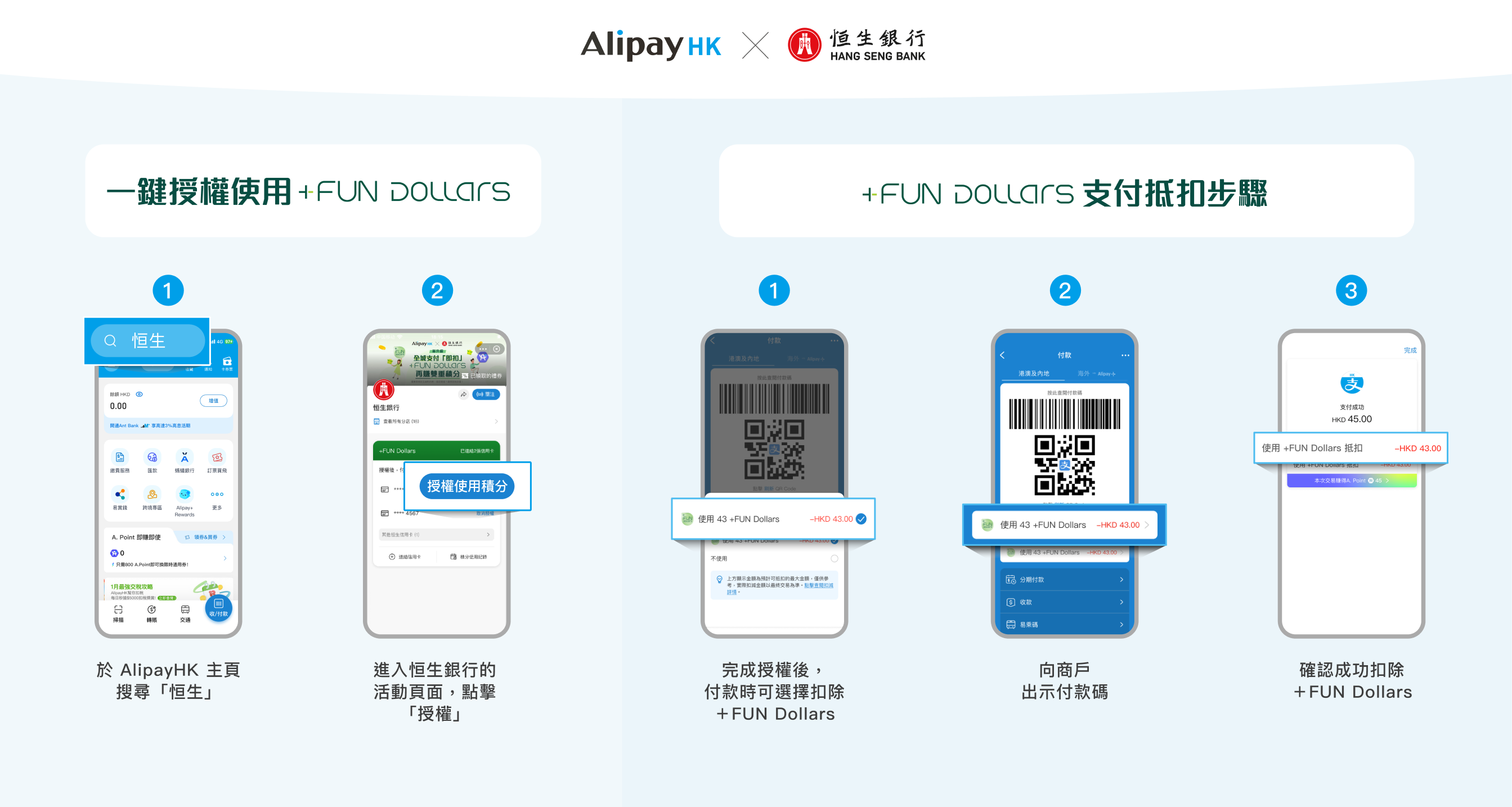 大公文匯全媒體報道,恒生銀行與AlipayHK攜手合作,為恒生信用卡客戶和AlipayHK用戶帶來嶄新的支付體驗。客戶在AlipayHK綁定恒生信用卡後,便可在本地消費時即時扣減+FUN Dollars。恒生為香港首家銀行透過AlipayHK提供信用卡積分抵扣服務,同時AlipayHK龐大的香港商戶網絡亦為+FUN Dollars拓闊了使用範圍。