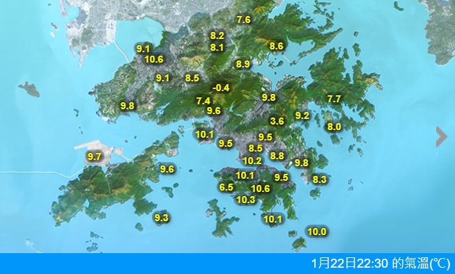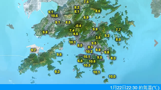 天文台再調低明日(23日)氣溫預測,市區氣溫會由初時約10度顯著下降至明日最低約6度,新界再低幾度,高地有可能結冰。