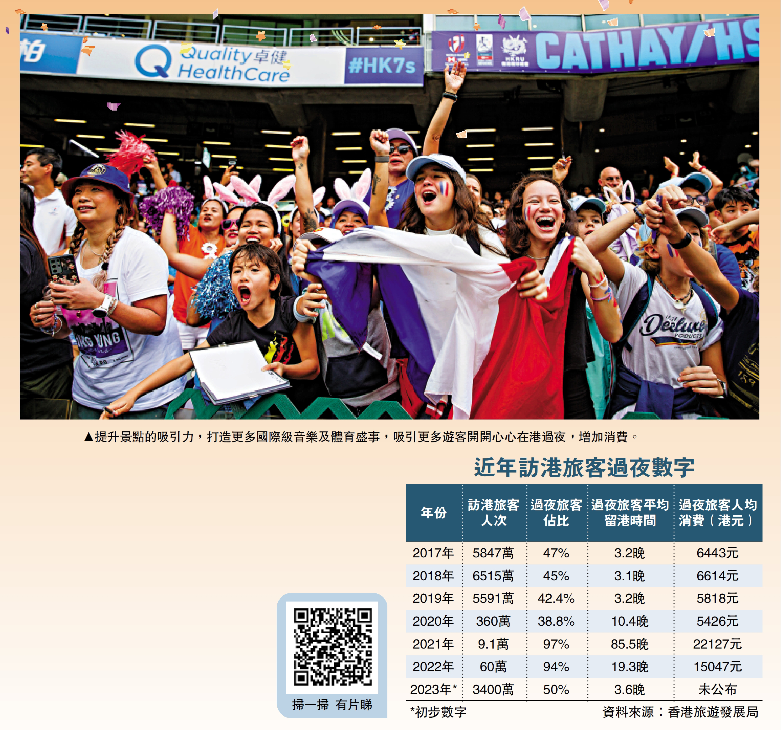 香港旅遊發展局數據顯示,2023年全年初步訪港旅客數字為3400萬,內地客佔約79%,過夜旅客平均留港時間,由疫情前約3.1晚,延長至2023年約3.6晚,仍有提升空間。