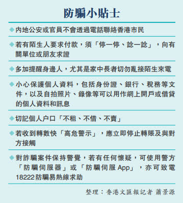 「傀儡戶口持有人如同騙徒幫兇!」港島總區刑事部高級督察洪諭因昨日在記者會上指出,傀儡戶口持有人透過出賣自己的銀行戶口,成為犯罪分子清洗資金的工具,是詐騙集團進行犯罪非常重要的一部分,即使該些戶口的持有人沒有直接參與詐騙,但對騙案受害人來說講,仍是詐騙集團的重要幫兇。