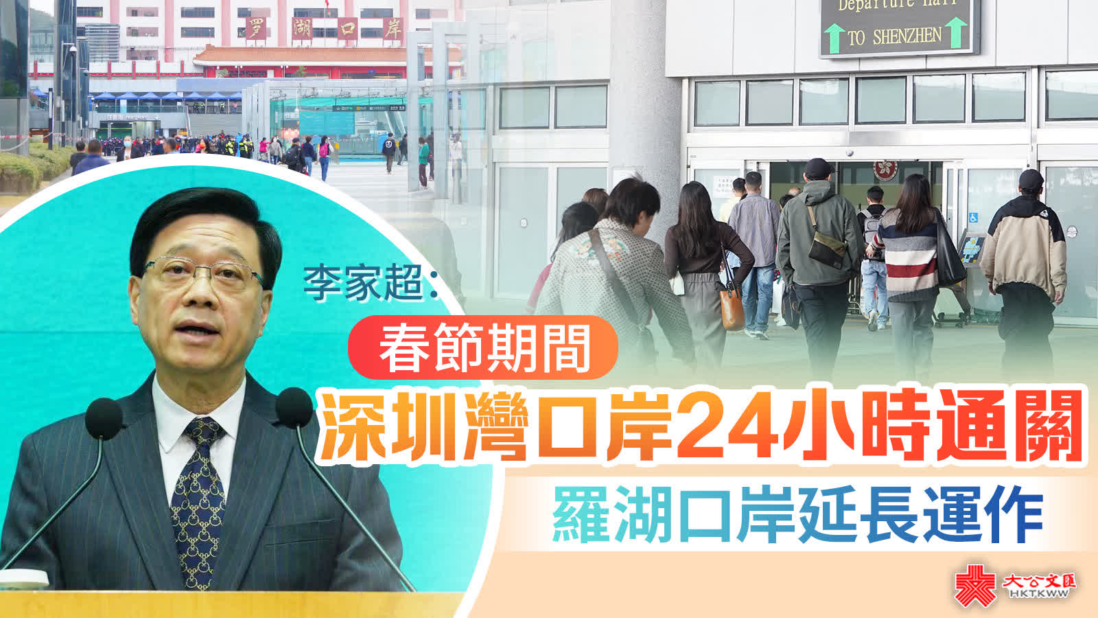 大公文匯全媒體報道,行政長官李家超今日(23日)出席行會前見記者時宣布,農曆新年期間5日,即年三十至年初四(2月9日至13日)期間,深圳灣口岸將實行24小時運作,包括旅客及車輛;年三十及年初二(2月9日及2月11日)兩日,羅湖口岸延長運作兩小時至凌晨2時,港鐵相應延長服務。