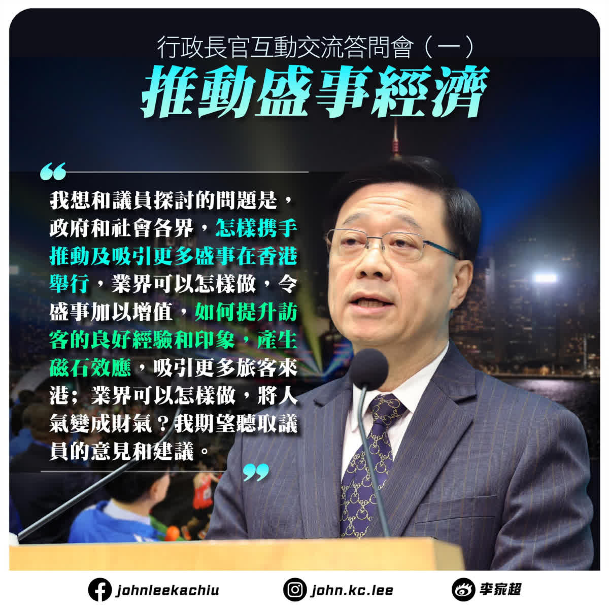 李家超表示,關於推動城市經濟,想同議員探討的問題是:政府同社會各界如何攜手,推動與吸引更多的盛事在香港舉行;業界可以如何做使盛事增值,及如何提升訪客的良好體驗與印象,產生「磁石效應」,進而吸引更多的旅客來到香港;以及業界如何將「人氣」變成「財氣」。李家超期望聽取議員的意見與建議。