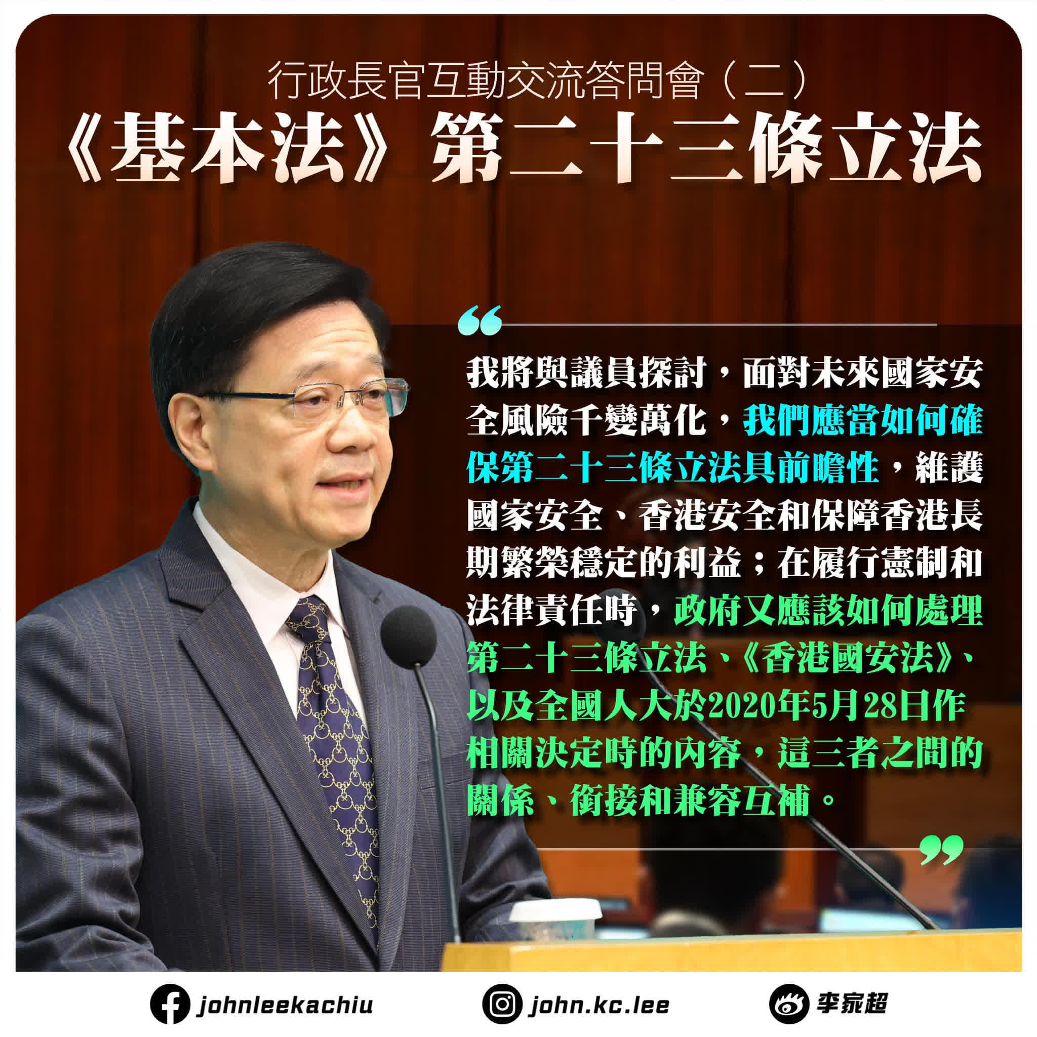 李家超指,政府會盡快完成23條本地立法工作,實踐26年多來香港未履行的憲制責任。他表示,國家安全是市民福祉與經濟發展的最佳保障,將會同議員探討面對未來國家安全風險千變萬化,香港應當如何去確保第23條本地立法具前瞻性、維護國家安全香港安全與保障香港長期繁榮穩定的利益。