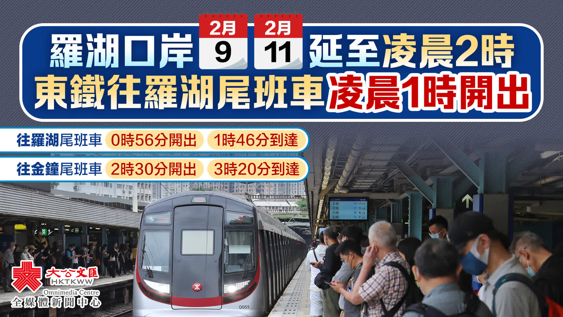 港鐵表示,會全力配合羅湖口岸於年三十及年初二晚的特別安排,延長東鐵綫往返羅湖站的列車服務時間。屆時,東鐵綫最後一班前往羅湖站的北行列車,將延至凌晨0時56分於金鐘站開出,約於凌晨1時46分到達羅湖站(即口岸關閉前約14分鐘);最後一班離開羅湖站的南行列車,則會於凌晨2時30分(即口岸關閉後約30分鐘)開出,約於凌晨3時20分到達金鐘站。