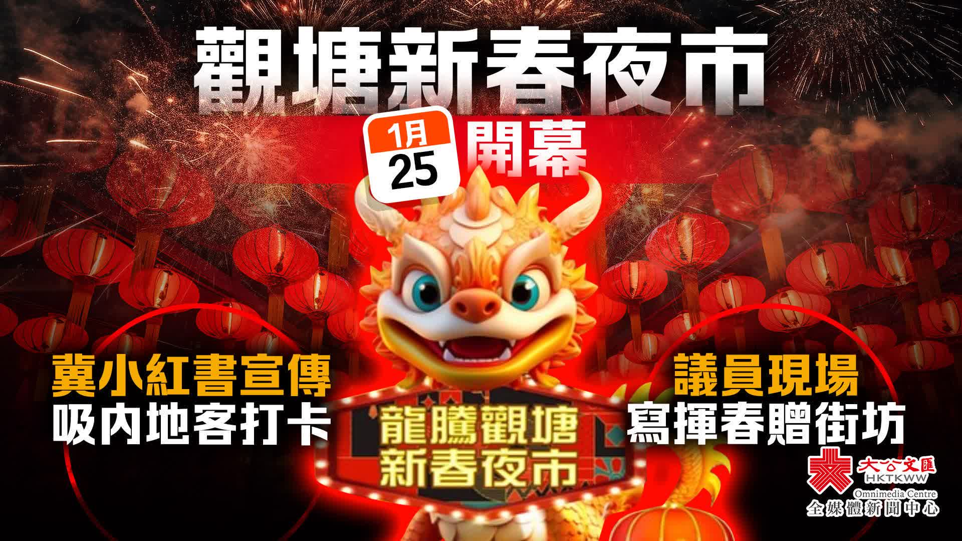 此外,觀塘新春夜市1月25日開幕,活動內容包括「年宵食品市集」、「龍年迎新歲」、開幕典禮表演、「香港文創」工作坊、攤位遊戲、議員贈揮春等,現場商戶每日都會舉辦優惠活動,如一蚊一隻雞、舞台大抽獎……