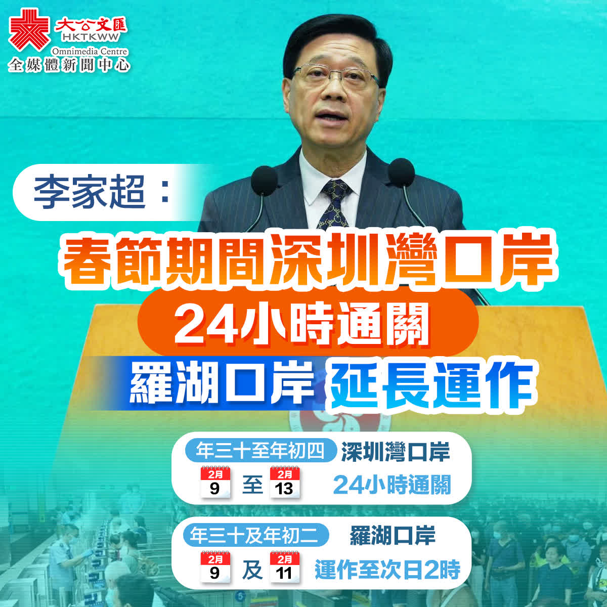 行政長官李家超今天宣布好消息:年三十至年初四深圳灣口岸24小時通關,年三十及年初二羅湖口岸延長運作至凌晨2時,港鐵相應延長服務。