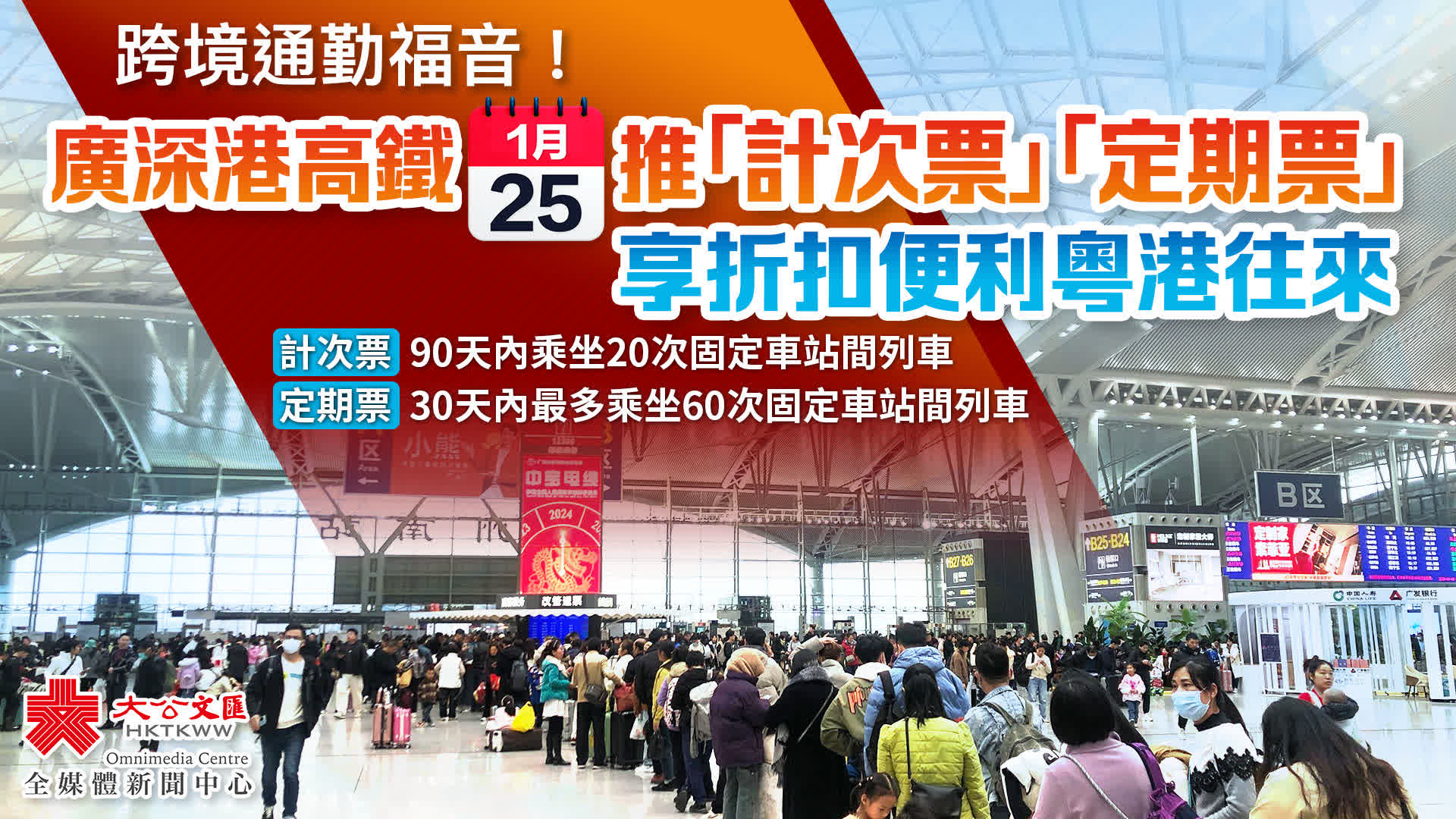 (大公文匯網 記者 方俊明)自去年1月廣深港高鐵復通以來,受到跨境乘客歡迎,2023年全年發送旅客突破2千萬,刷新開通以來記錄。為進一步便利頻繁往返粵港兩地的乘客,滿足多樣化出行需求,廣深港高鐵將於明天(25日)推出20次「計次票」和30日「定期票」,相比於普通購票,可享受一定的折扣。