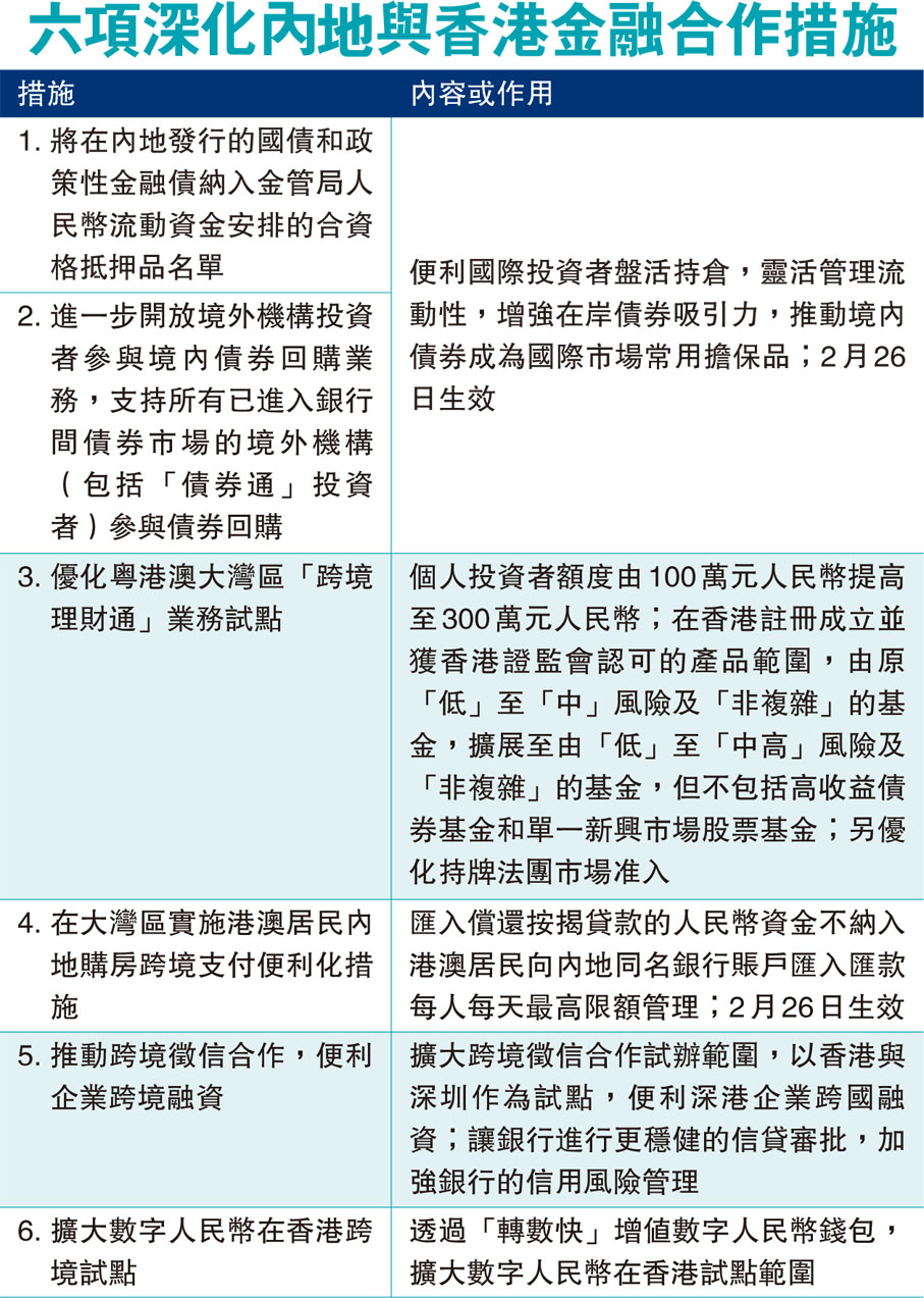 市場人士分析指,昨日的合作措施將可提升外資參與內地債市的興趣,亦可便利港澳居民匯款到內地置業。中銀香港副總裁徐海峰表示,如有關放寬境外投資者准入要求,明確業務範圍為銀行間債券市場買斷式回購與質押式回購兩個交易品種,並界定了「債券轉移過戶」的形式,亦為境外投資者提供更貼合國際市場的機制安排,並為更廣泛的境外投資者參與內地債券回購交易業務提供便利,同時進一步豐富人民幣流動性管理工具,拓寬人民幣資產擔保品屬性的應用空間,有助境外投資者更好配置優質人民幣資產。