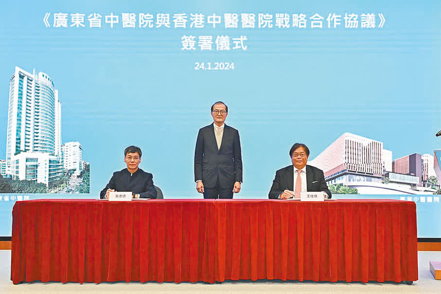 廣東省中醫院院長張忠德和香港中醫醫院董事局主席王桂壎,昨日在香港浸會大學簽署《廣東省中醫院與香港中醫醫院戰略合作協議》,奠定雙方的合作基礎和方向。