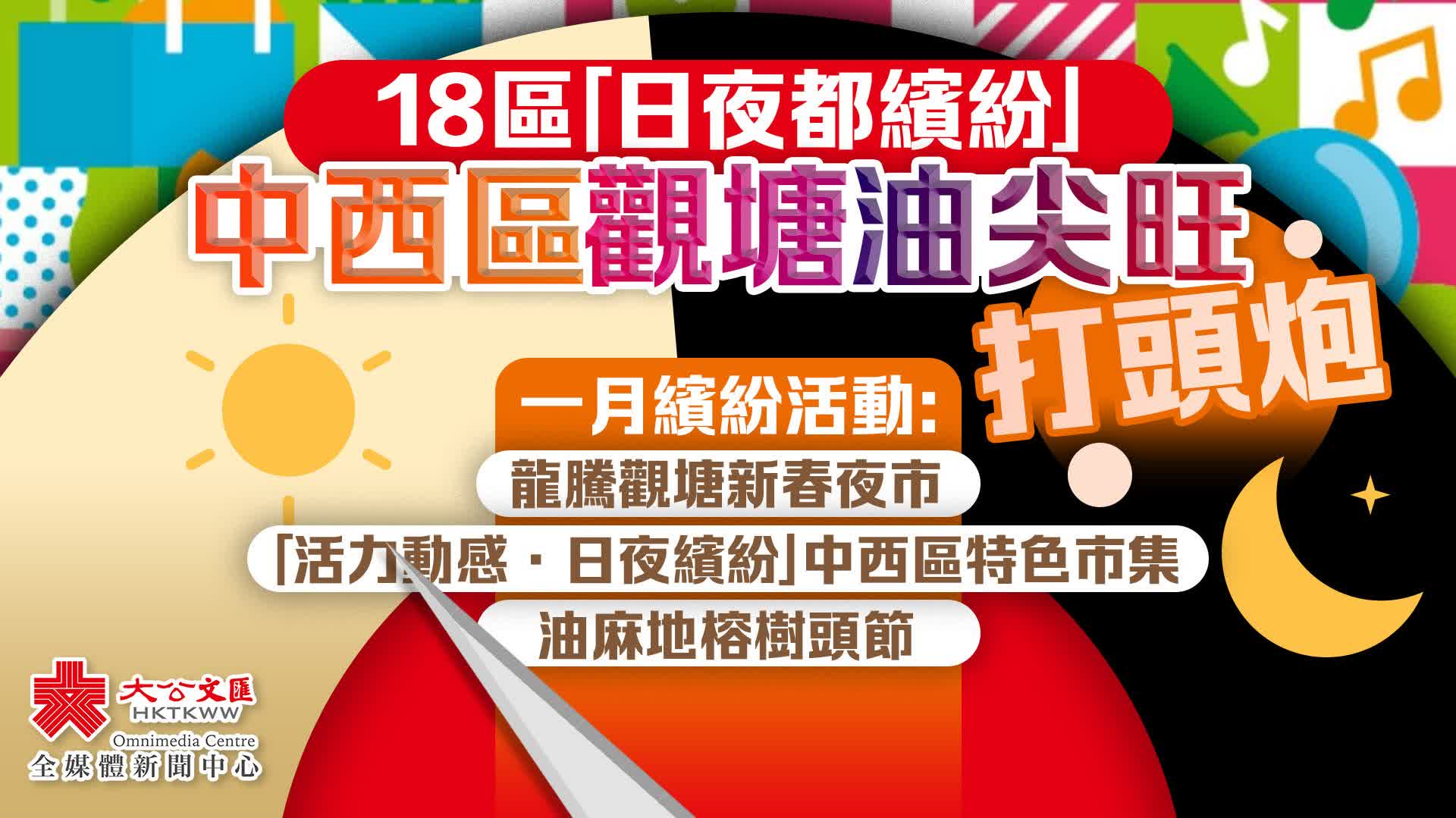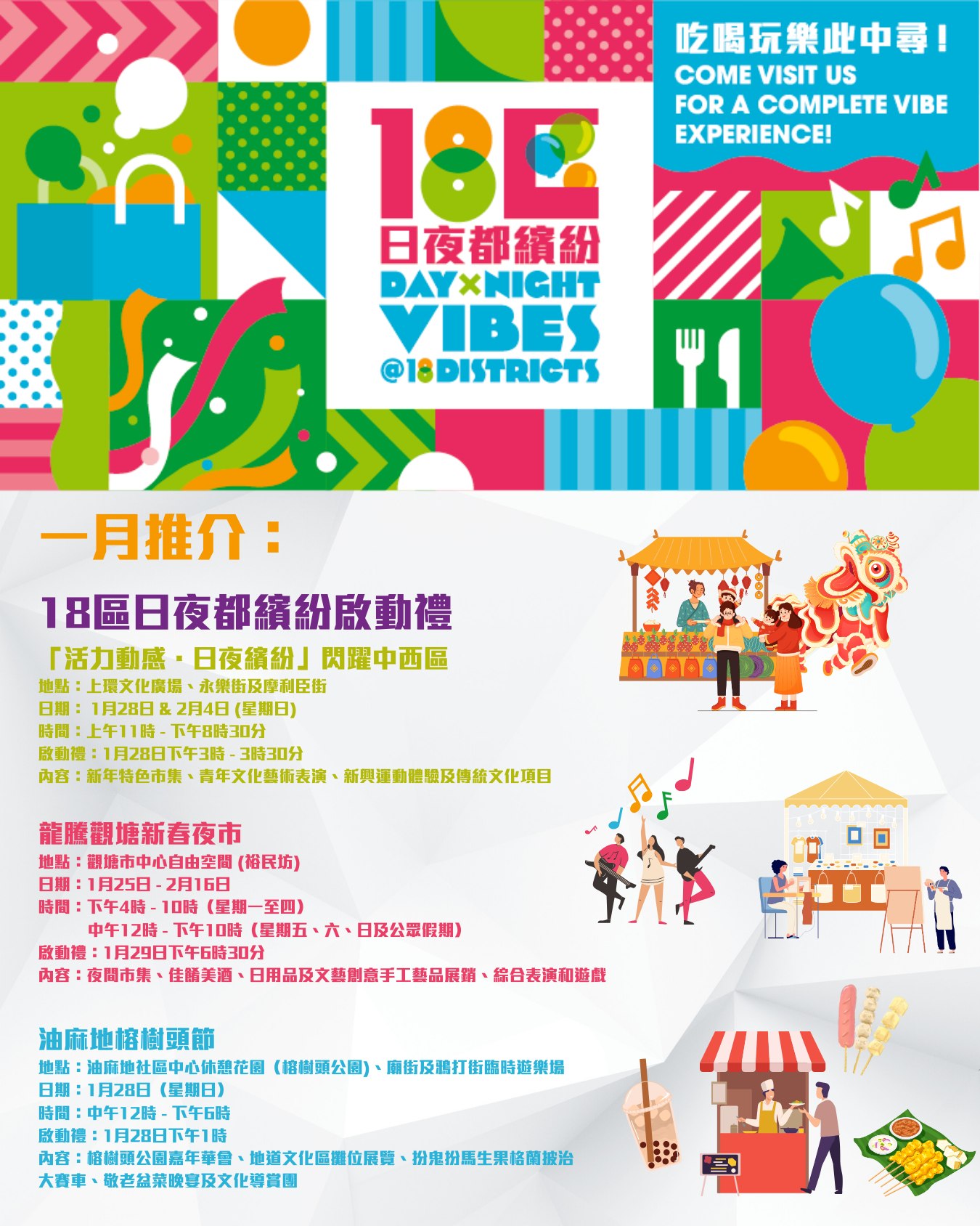 18區日夜都繽紛啟動禮本周日(28日)在上環文化廣場會舉行,約定你一齊開展全港繽紛之旅!一月繽紛活動包括龍騰觀塘新春夜市、「活力動感·日夜繽紛」閃躍中西區以及第五屆《油麻地榕樹頭節》,詳情如下: