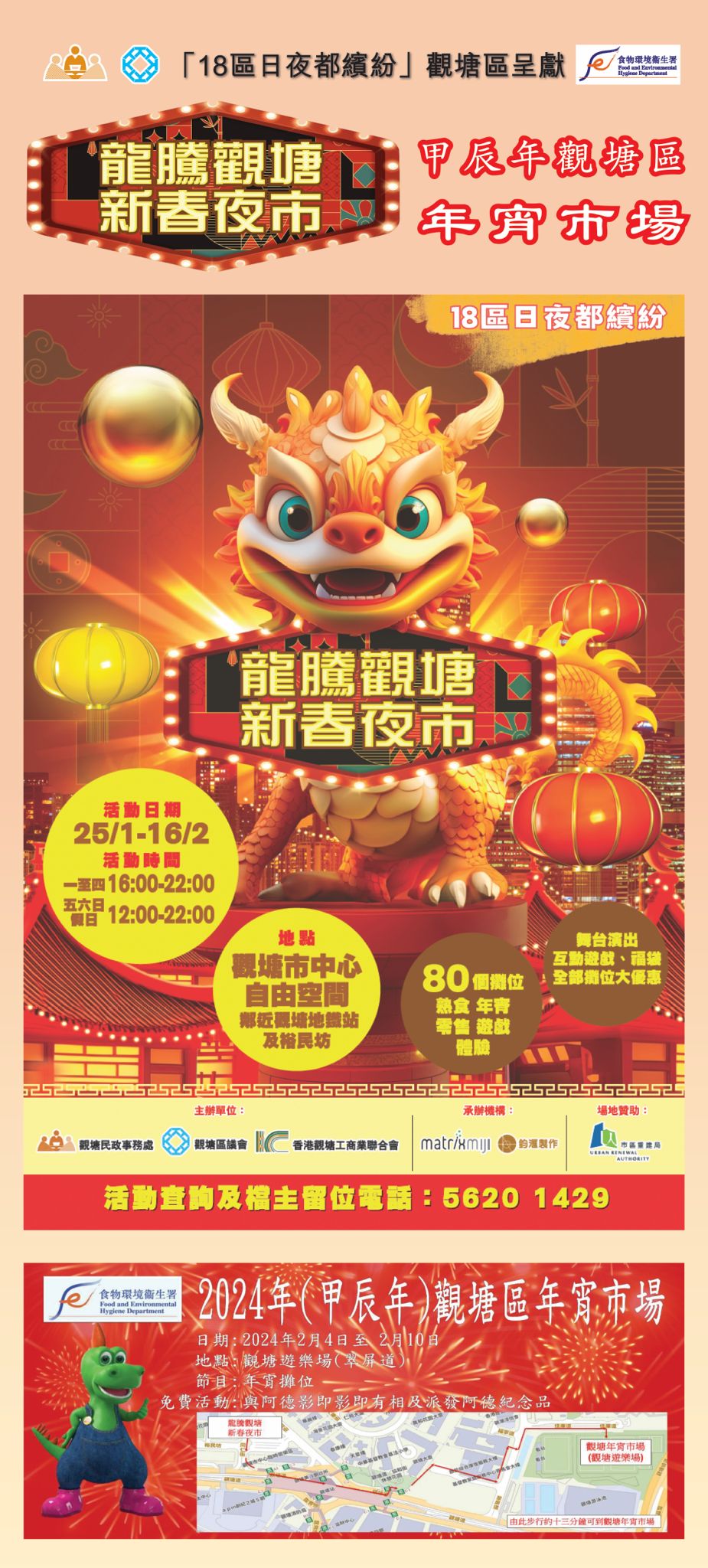 | 2024年1月25日至2月16日 | 龍騰觀塘新春夜市 | 觀塘市中心自由空間(裕民坊) | 觀塘民政事務處、觀塘區議會、香港觀塘工商業聯合會 | hkktica@hkktica.org.hk |