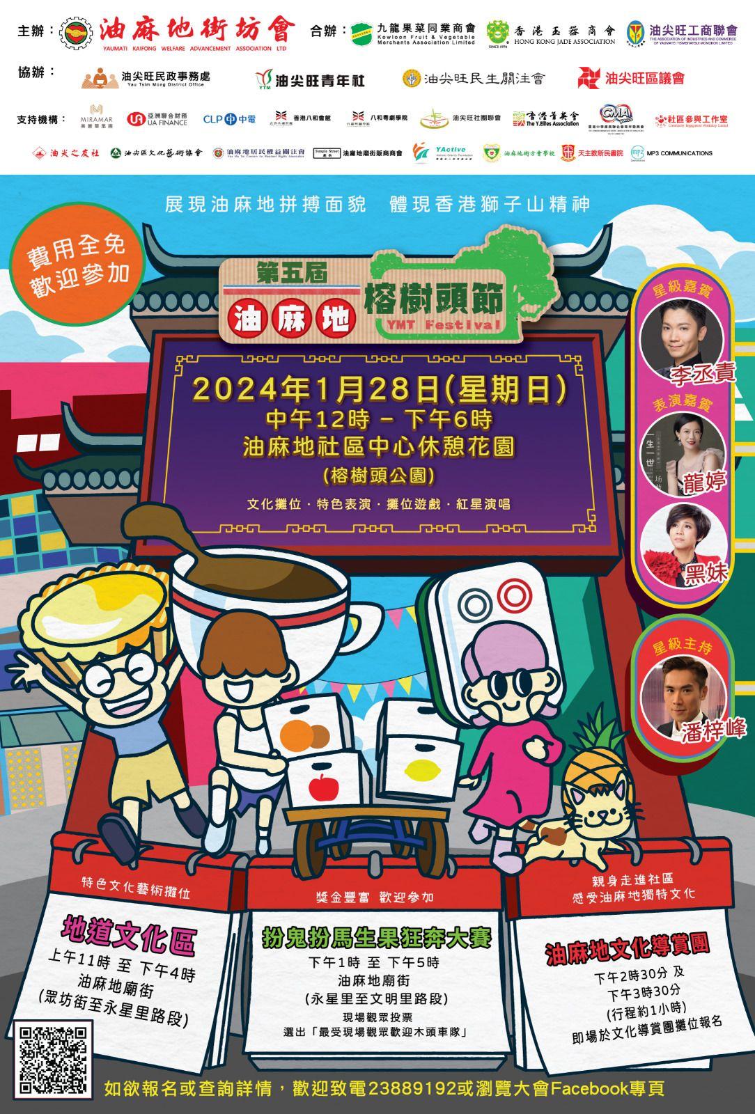 | 2024年1月28日 | 第五屆《油麻地榕樹頭節》 | 油麻地社區中心休憩花園(「榕樹頭公園」)、廟街及鴉打街臨時遊樂場 | 油尖旺民政事務處、油尖旺區議會、油麻地街坊福利促進會 | ymtkfwaa@yahoo.com.hk |