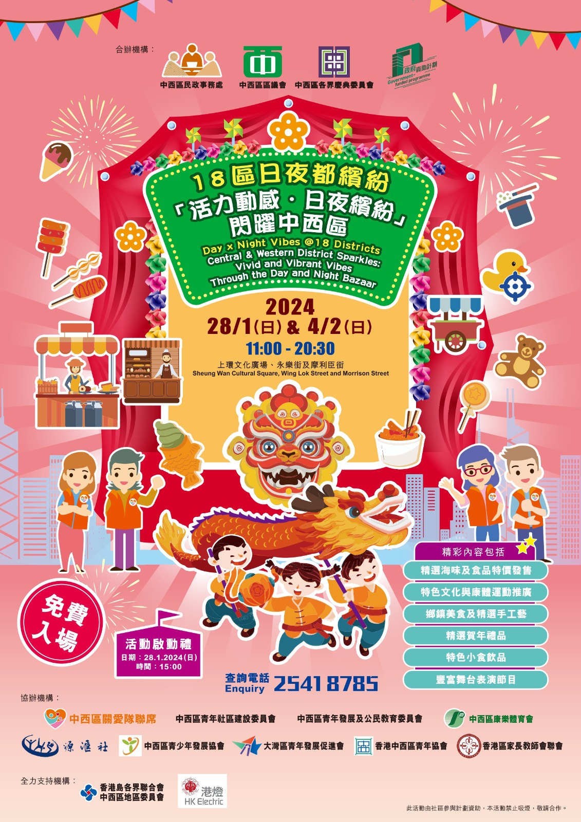 | 2024年1月28日及2月4日 | 「活力動感.日夜繽紛」閃躍中西區 | 上環文化廣場、永樂街及摩利臣街 | 中西區民政事務處、中西區區議會、中西區各界慶典委員會 | docw@had.gov.hk |