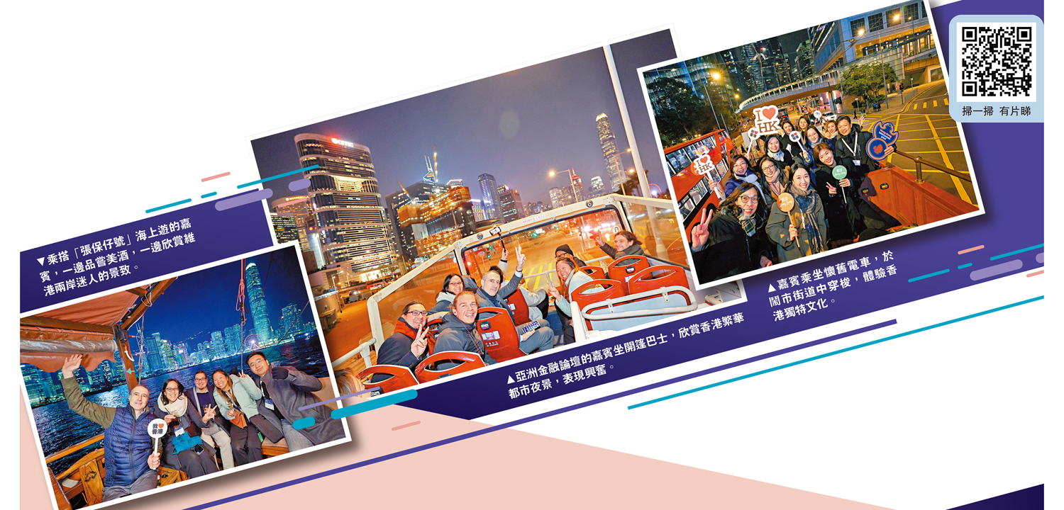 100多名出席亞洲金融論壇的嘉賓,過去兩晚參與旅遊發展局安排的海、陸夜景深度遊活動,他們有來自中國內地、法國、美國、波蘭和英國等地方,一批嘉賓於前日傍晚在灣仔登上傳統中式帆船「張保仔號」,暢遊維港,一邊品嘗美酒,一邊陶醉於華麗浪漫的天際下,不時舉起手機拍下維港兩岸迷人的景致。另一批嘉賓乘搭仿1920年代樣式設計的復古電車,由上環至銅鑼灣,沿途欣賞璀璨夜色下的鬧市街道,享受約一小時的懷舊「叮叮」之旅。昨晚則有另一批嘉賓乘搭開篷巴士遊覽灣仔、銅鑼灣、金鐘與中環一帶。