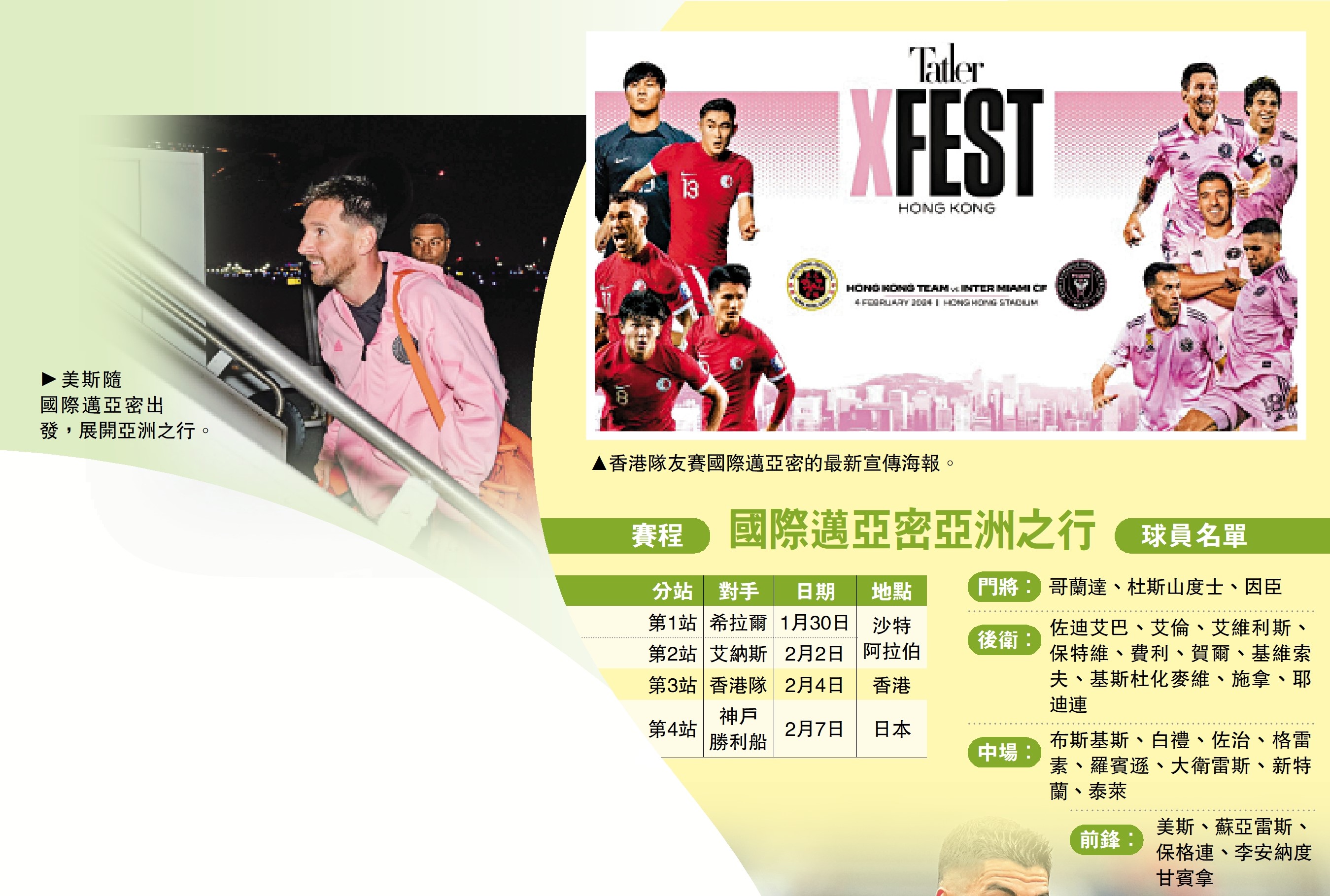 (大公報記者 張銳)國際邁亞密的亞洲之行名單公布後,相信不少香港球迷看到美斯在名單上都鬆了一口氣。不過,以有C朗拿度效力的艾納斯早前原定的中國之行延期為前車之鑒,又難免令球迷憂慮美斯包括2月4日訪港一仗,差不多一星期內共踢3場熱身賽,在密集賽程下將挑戰球王的體能。