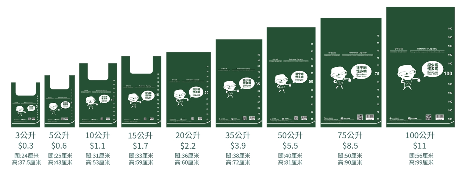 9款指定垃圾袋容量由3公升至100公升,售價由3毫子至11元,指定袋上印有二維碼,以供市民查閱該袋的批次,並且亦印有環保署標誌。環保署表示,市民在購買指定袋時不會被限制購買的數量,但要視乎不同零售店的實際情況及存貨,如果市民購買指定袋後,發現有破損或其他問題,可向相關零售店跟進更換。