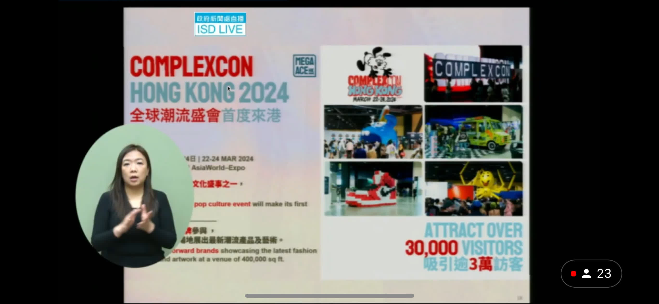 第三項盛事為3月22至24日的美國著名國際流行文化盛事ComplexCon來港,為首度在美國以外地區舉辦,在委員會的支持及牽線下,選址亞洲國際博覽館,佔地約40萬平方呎。ComplexCon為全球最大型的潮流文化盛事,每年在洛杉磯舉行,每場有超過5.5萬人參加。今次ComplexCon將有多個頂尖潮流品牌參與,展出最新時尚產品設計及藝術,預計會吸引逾3萬名年輕遊客及市民參與。