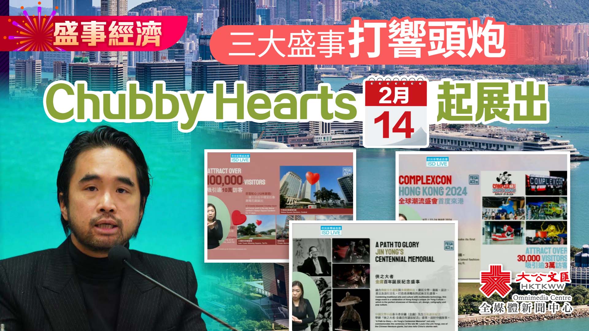 大公文匯全媒體報道,特區政府今日(26日)舉行記者會,介紹今年香港舉辦的多項大型盛事詳情。文化藝術盛事委員會主席鄭志剛表示,今年會推出9項大型盛事,其中Chubby Hearts、金庸百年誕辰紀念及ComplexCon這3項盛事將在近期打響頭炮。
