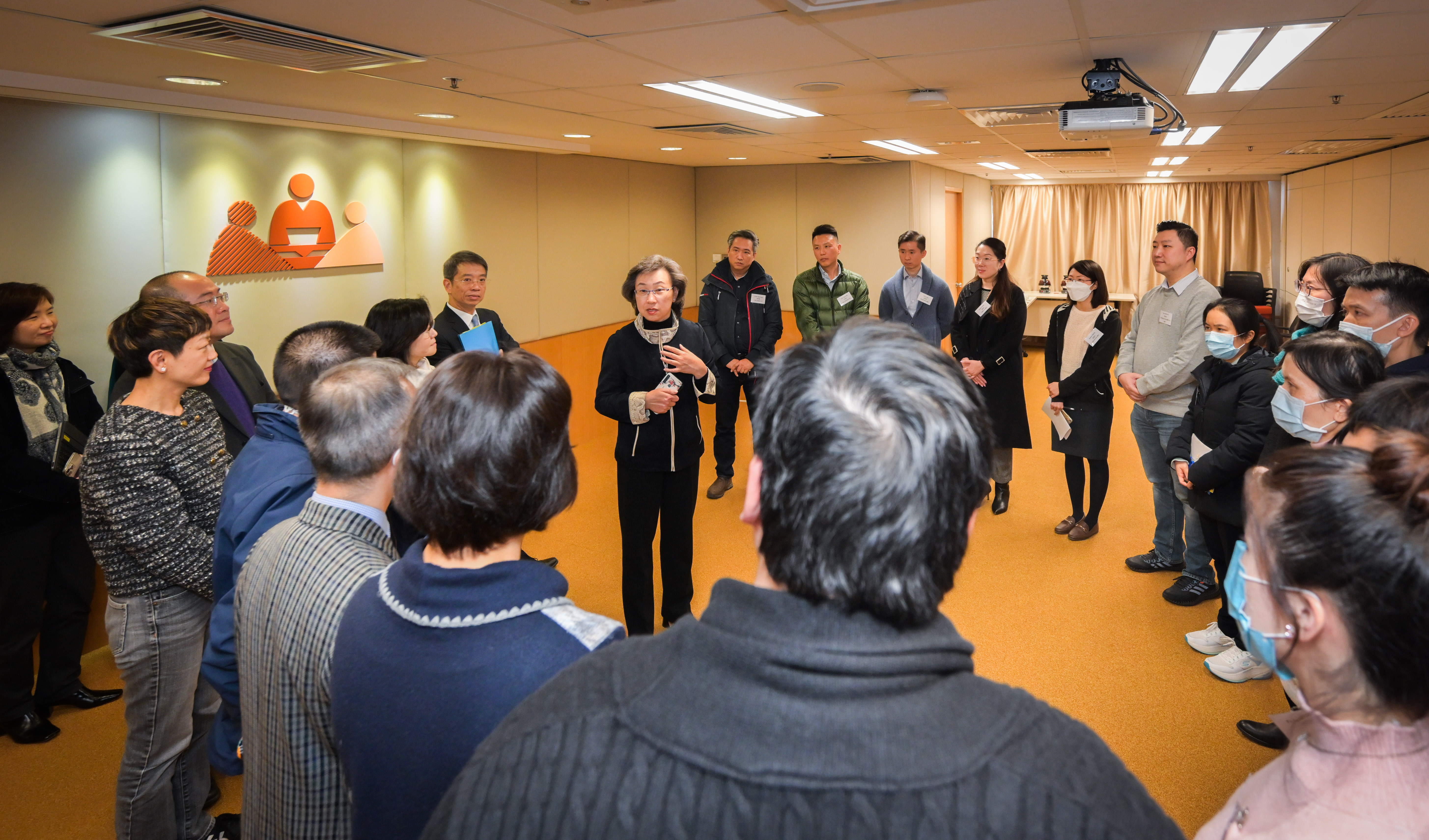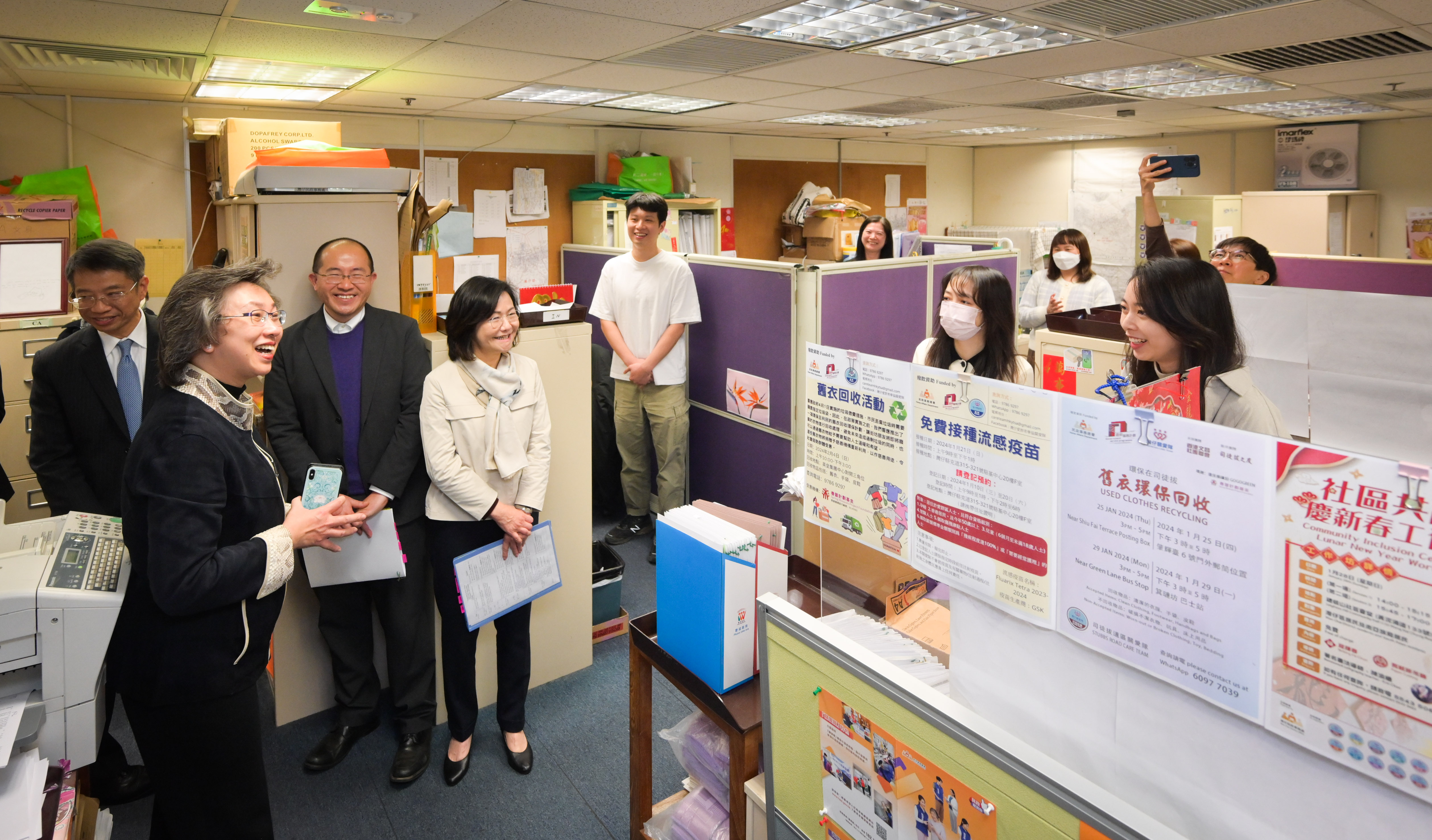 她分別探訪負責支援和監察「地區服務及關愛隊伍」、支援大廈管理和推廣社會企業的組別。她聆聽前線人員簡介如何與各區共452支「關愛隊」協調,加強支援地區工作和地區網絡。楊何蓓茵欣悉各區民政事務處將與區議會攜手,在農曆新年前與當區「關愛隊」合作,在區內推出一系列關愛行動,為區內長者和有需要人士送上關懷和支援。