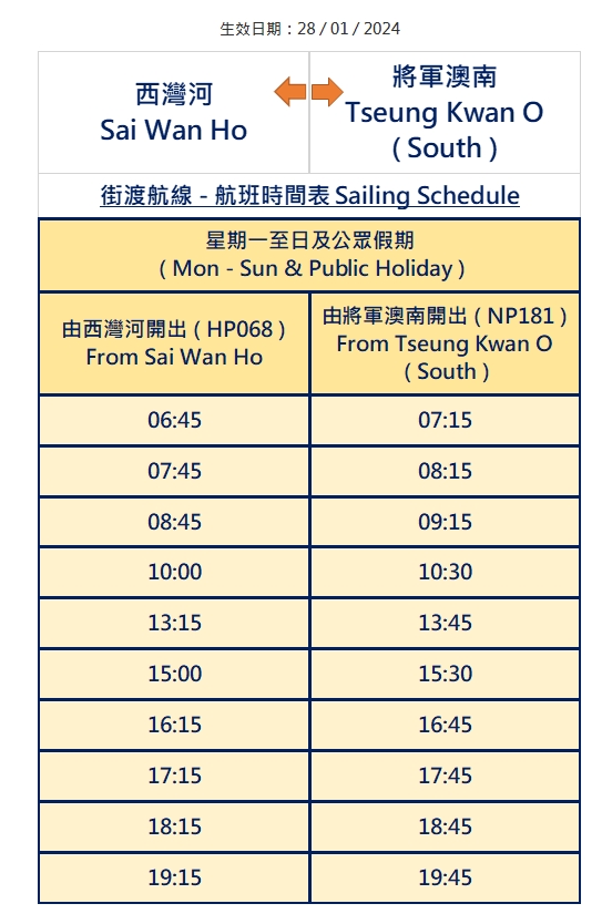 根據時刻表,「將軍澳(南)—西灣河」街渡服務周一至周日及公眾假日提供服務,由6時45分至晚上7時45分,來回共20班船,早晚均為一小時一班。成人票價16.8元,小童票價8.5元;寵物票價以成人票16.8元收費,單車每輛收16.8元,貨物每0.1立方米收16.8元;「樂悠咭」持有人、長者和殘疾人士使用八達通收兩元。