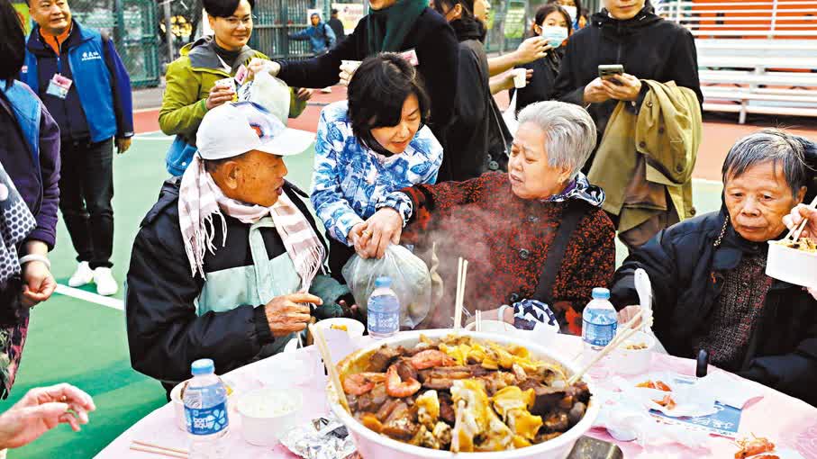 (香港文匯報 記者 康敬)農曆新年即將到來,團年飯素來是傳統活動,象徵着團圓與溫暖,來自黃大仙區的超過2,500位居民,包括獨居長者、雙老及基層家庭昨日在慈雲山邨中央遊樂場共同參加一場「關愛送暖到社區 萬歲新春團年飯」活動,香氣騰騰的盆菜、熱熱鬧鬧的聚會足夠溫暖人心。昨日天氣仍然有些寒冷,場內貼心地設有多個暖燈,住得較遠的長者亦有大旅遊巴士接送,每枱還有一兩位關愛隊隊員或義工照顧長者用餐等,政、商、民等多重力量順利結合,把地區關愛延伸到社區更多面。