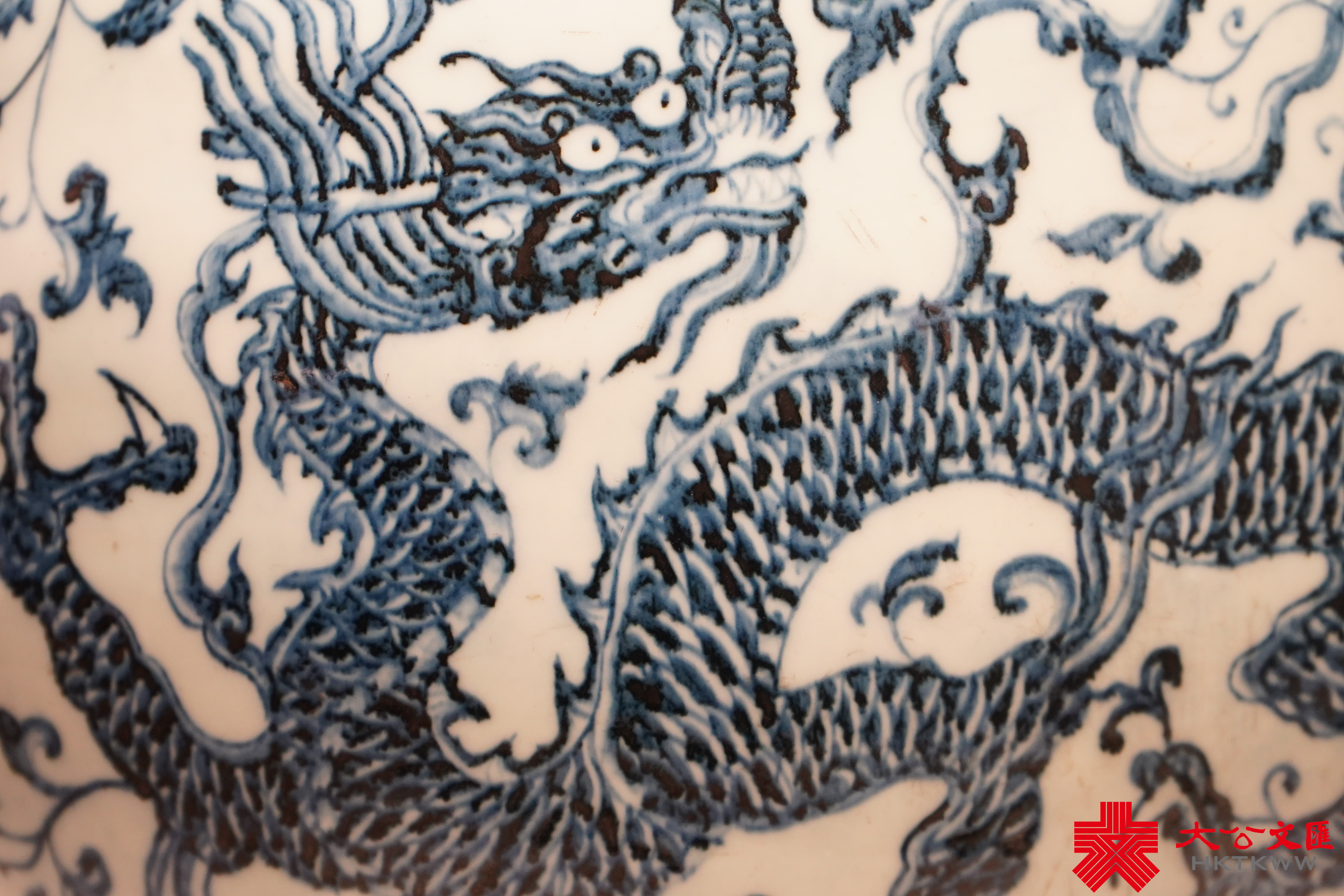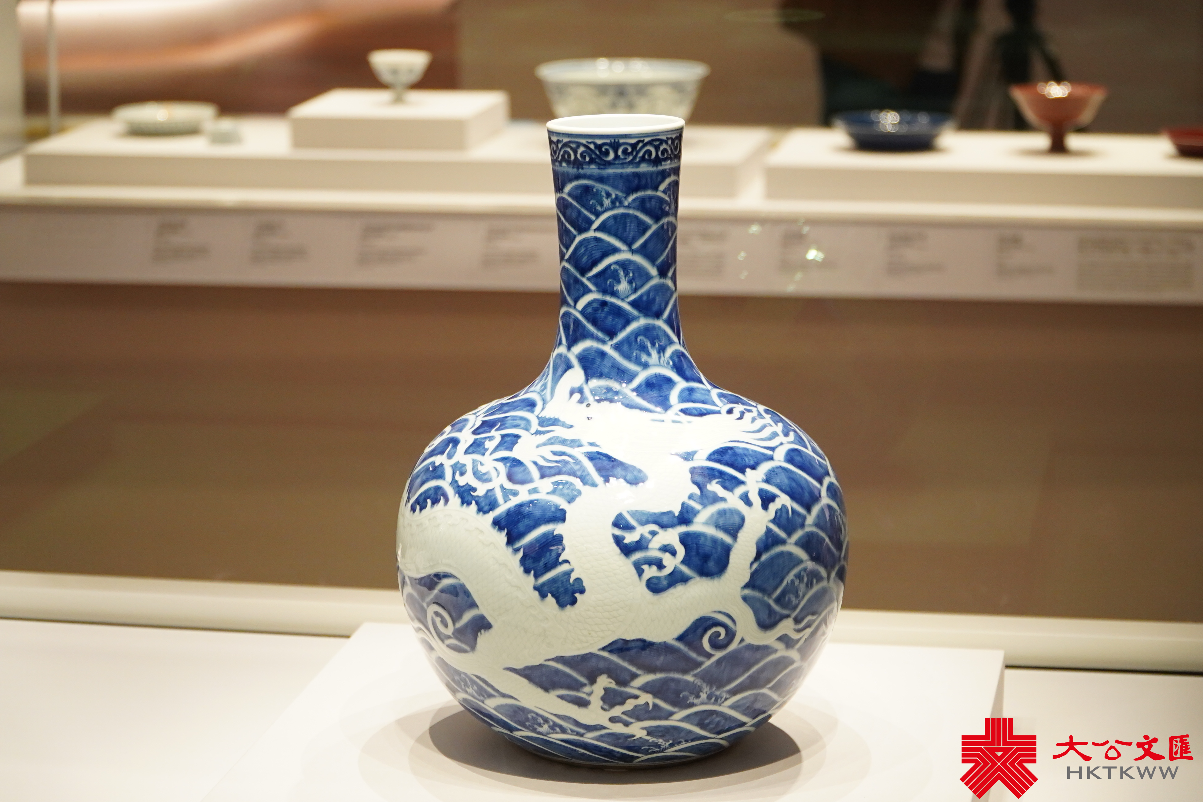 天球瓶因瓶身渾圓似天體星球而得名。此瓶飾海水龍紋,龍身以「錐拱」技法表現細部,海水紋則以鈷料着色再細緻描繪,乃仿永樂朝御窯瓷器燒造而成。類似的裝飾手法更可上溯至元代,體現出瓷器纹飾與工藝的代代延續。