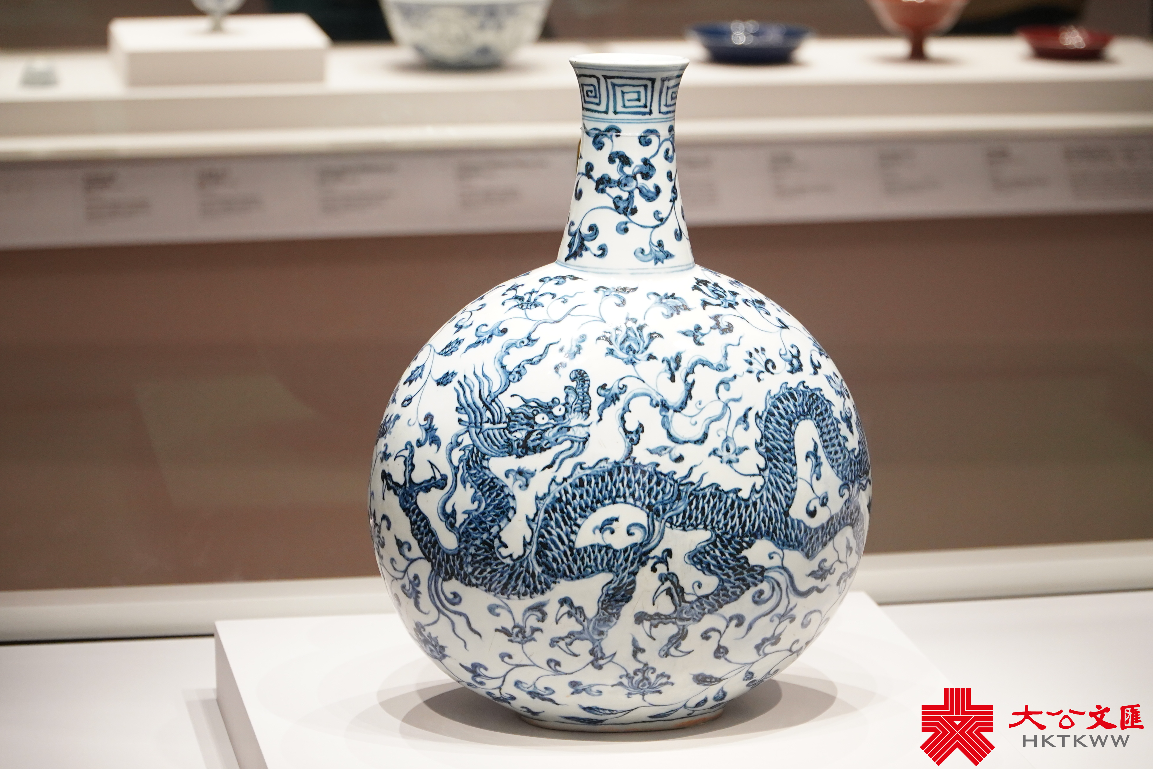 穿花龍紋是明代瓷器上常見的裝飾紋樣。此龍穿梭於纏枝花之間,形像矯健生動。扁壺外形仿西亞器皿,反映出明朝與鄰近地區的交往。瓶身以西亞進口的鈷料「蘇麻離青」繪就,發色濃艷。