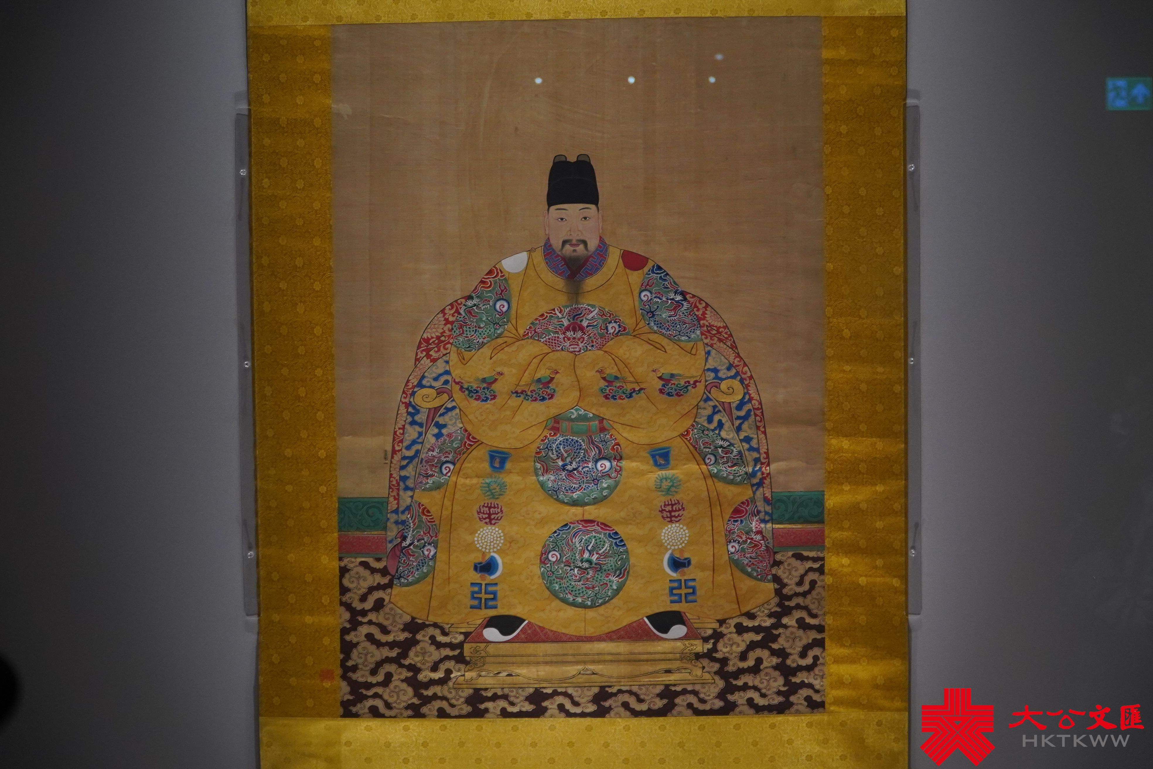 朱祐杬(1476-1519年),明憲宗成化帝之子、武宗正德帝之叔。謚號「獻」,為「興獻王」。武宗崩後,無嗣繼位,朱祐杬次子朱厚熜入繼大統,為世宗嘉靖帝。嘉靖即位後通過「大禮議」事件,追尊朱祐杬為皇帝。像中朱祐杬頭戴翼善冠,身着十二章紋龍袞,貌為壯年,神態莊嚴而溫雅。此像冠服皆同帝制,推測大約作於其被追封為皇帝之後。畫作雖未署名款,但筆法工整、敷色絢麗,承皇家華貴風格,應為宮廷畫師所繪。