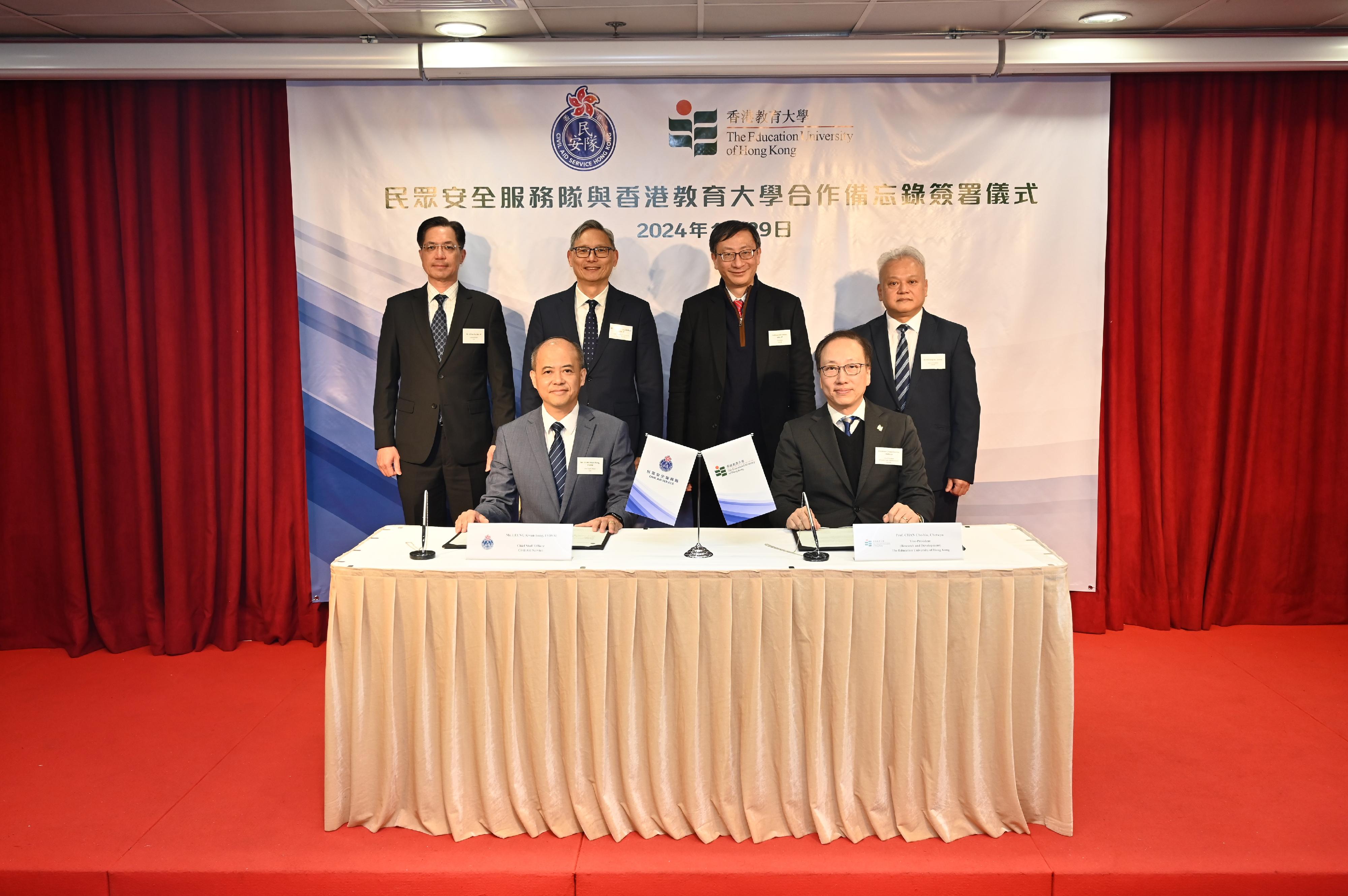 大公文匯全媒體報道,民眾安全服務隊(民安隊)與香港教育大學(教大)今日(29日)簽署合作備忘錄,鞏固雙方合作關係。合作備忘錄由民眾安全服務處總參事梁冠康和教大副校長(研究與發展)陳智軒簽署,簽署過程由保安局副局長卓孝業、民安隊處長羅仁禮、教大校長李子建和學生事務長許景輝見證。